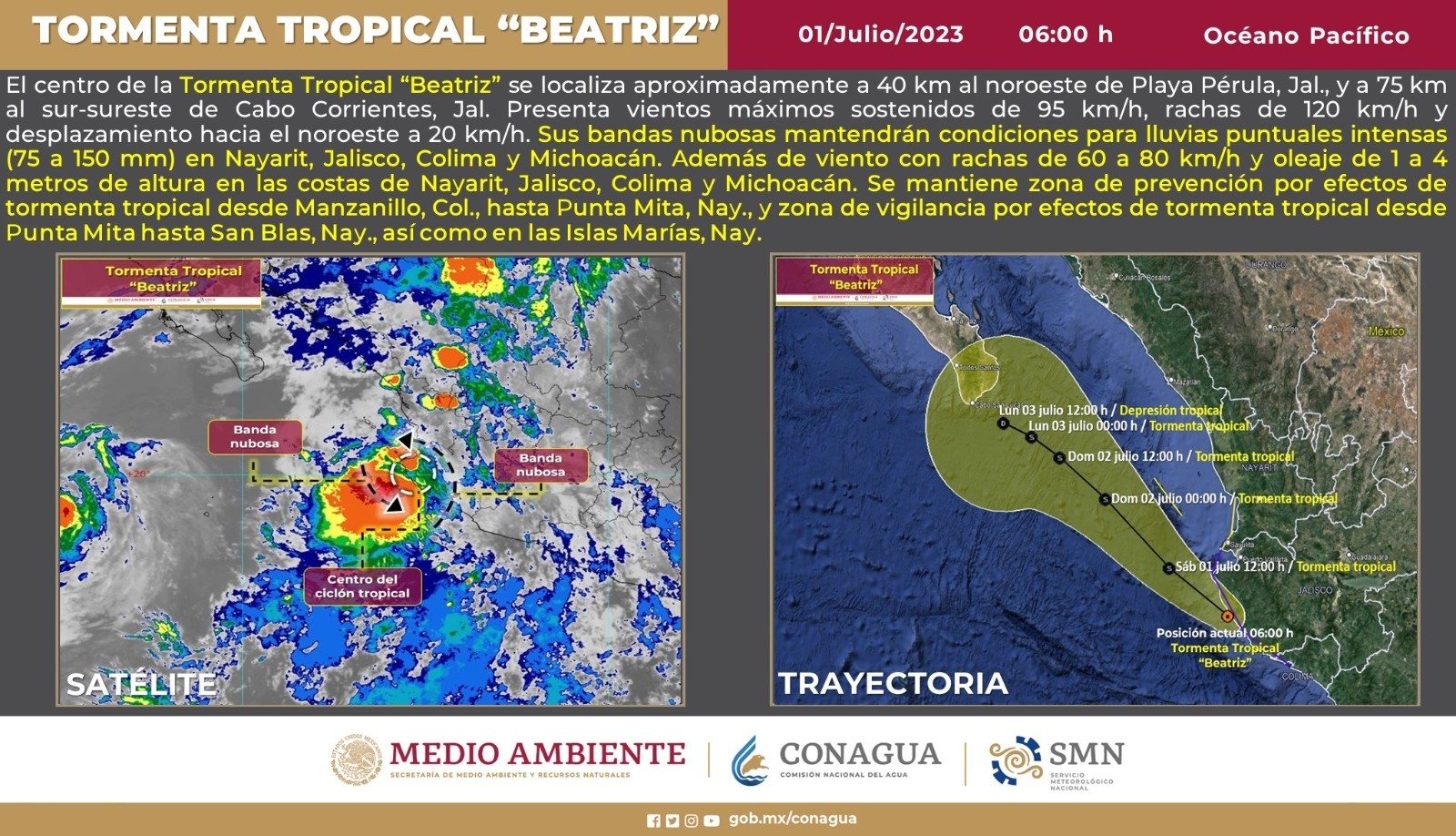 México | Beatriz EN VIVO: Noticias y actualizaciones del ciclón en el Pacífico Mexicano Estas son las actualizaciones, reportes de lluvias, inundaciones y otras afectaciones por la posible nueva tormenta tropical "Beatriz" en México Oralia López 1 de julio de 2023 - 07:00 hs 2023-07-01 07:00Información actualizada sobre la trayectoria de "Beatriz" por el Pacífico mexicano, indica que el huracán se encuentra a 40 km al noroeste de Playa Pérula, Jalisco. Ocasionará lluvias intensas en Nayarit, Jalisco, Colima y Michoacán. ESPECIAL / SMN Beatriz se degrada a tormenta tropical 2023-07-01 04:00A las 03:00 horas, tiempo del centro de México, "Beatriz" es tormenta tropical y su centro se localiza 20 kilómetros (km) al sur-sureste de Playa Pérula y a 130 km al sur-sureste de Cabo Corrientes, Jalisco, con vientos máximos sostenidos de 100 kilómetros por hora (km/h), rachas de 120 km/h y desplazamiento hacia el noroeste a 20 km/h. Las bandas nubosas de Beatriz propician lluvias intensas (de 75 a 150 milímetros [mm]) en Colima, Jalisco, Michoacán y Nayarit, así como vientos con rachas de 60 a 80 km/h y oleaje de 1 a 4 metros (m) de altura en las costas de Colima, Jalisco, Michoacán y Nayarit. Las precipitaciones de mayor intensidad podrían ser con descargas eléctricas, rachas fuertes de viento y granizadas, así como generar deslaves, incremento en niveles de ríos y arroyos, desbordamientos e inundaciones en zonas bajas de los estados mencionados. Conagua TWITTER/conagua_clima Despliegan Plan DN-III y Plan Marina en Baja California Sur 2023-07-01 00:00Como medida preventiva ante las proyecciones de desplazamiento del huracán "Beatriz" (categoría 1 en la escala Saffir-Simpson) que se advierte se aproxime a Baja California Sur y ocasione nubosidades y lluvias a partir del domingo, autoridades desplegaron los planes DN-III y Marina, en sus fases preventivas. Además, autoridades de la Tercera Zona Militar y la Segunda Zona Naval tienen brigadas listas en los cinco municipios del estado, con énfasis en el municipio de Mulegé que el año pasado registró las mayores afectaciones por lluvias torrenciales. En sesión del Consejo Estatal de Protección Civil, representantes de la Comisión Nacional del Agua (Conagua) informaron que conforme avance el meteoro podría debilitarse a tormenta tropical, aunque ya frente a las costas de la porción sur del estado, y se pronostican lluvias para el municipio de Los Cabos. SUN Prevén que Beatriz pase por Jalisco este sábado; afectaría a 14 municipios 2023-06-30 17:54Este viernes autoridades de los tres órdenes de gobierno se reunieron en la primera sesión ordinaria del Comité Estatal de Emergencia de Protección Civil ante el paso de Beatriz, el huracán categoría 1 que se ha formado en el océano Pacífico y que se prevé, se acerque a Jalisco. Estados que serán afectados por el huracán Beatriz este 1 y 2 de julio 2023-06-30 16:12Este viernes, la Comisión Nacional del Agua (Conagua) alertó que se prevé que la tormenta tropical Beatriz evolucione a huracán categoría 1 en la escala Saffir-Simpson y pronosticó lluvias torrenciales en diversos estados. La Conagua señala que la trayectoria de la tormenta tropical Beatriz es con desplazamiento paralelo a las costas de Colima, Jalisco y Michoacán, podrían generarse lluvias torrenciales en Colima, Guerrero, Jalisco y Michoacán. Estos municipios de Jalisco, en alerta naranja por huracán "Beatriz" 2023-06-30 12:36El huracán "Beatriz", categoría 1 en la escala Saffir-Simpson, se localizó al mediodía de este viernes 30 de junio a 70 kilómetros (km) al suroeste de Lázaro Cárdenas, Michoacán, y a 110 km al oeste-suroeste de Zihuatanejo, Guerrero, con vientos máximos sostenidos de 130 kilómetros por hora (km/h), rachas de 155 km/h y movimiento hacia el noroeste a 20 km/h, lo que ha generado alerta naranja para varias municipios de los estados del occidente de México, entre ellos, Jalisco. Cierran 8 playas en Sinaloa por fuerte oleaje 2023-06-30 12:20Los efectos del huracán "Beatriz" comienzan a sentirse en las costas del Pacífico, pues además de cielos nublados, se presenta un fuerte oleaje en Mazatlán, Sinaloa, donde autoridades han cerrado 8 playas para evitar el ingreso de bañistas ante el riesgo de ser arrastrados. La Coordinación de Protección Civil de Mazatlán notificó que las playas cerradas son: Playa Brujas; Playa Cerrito; Playa Cerrito 1, 2, 3, 4, y 5; Playa Pato Blanco; Playa Sábalo 1 y 2; Playa Gaviota 1, 2, 3 y 4; y Playa Camarón. Se notificó a los visitantes que no pueden ingresar ante los riesgos que implican la corriente. Se esperan lluvias fuertes para la CDMX por "Beatriz" 2023-06-30 11:00El huracán "Beatriz", aunado a canales de baja presión, ocasionará fuertes lluvias y fuertes rachas de viento en varios estados de México, entre ellos la Ciudad de México (CDMX). Mientras tanto, la Secretaría de Gestión Integral de Riesgos y PC (SGIRPC CDMX) prevé un ambiente caluroso con cielo nublado, además se pronostican lluvias fuertes, actividad eléctrica y hasta granizo. Además, informó que la temperatura máxima será de 25 grados y ocurrirá en la alcaldía Venustiano Carranza, mientras que la mínima será de 16 grados. Las lluvias podrían registrarse a las 15:00 horas y se espera sean de 15 a 29 mm. "Beatriz" se intensifica a huracán frente a costas de Michoacán y Colima 2023-06-30 09:37El Servicio Meteorológico Nacional (SMN) informó que "Beatriz" se intensificó esta mañana a huracán categoría 1 en la escala Saffir-Simpson. Al momento, se localiza a 80 km al sur de Lázaro Cárdenas, Michoacán y a 285 km al sureste de Manzanillo, Colima. Prevén que "Beatriz" sea huracán este viernes 2023-06-30 08:45El SMN indica que en el transcurso del día, el desplazamiento de "Beatriz", paralelo a las costas del Pacífico mexicano, podría evolucionarlo a huracán de categoría 1. Originará hoy lluvias torrenciales en Jalisco, Colima,