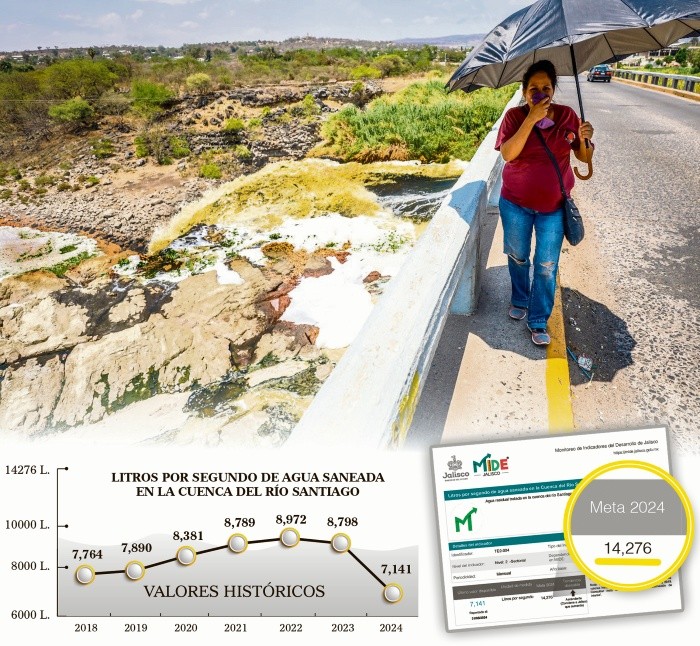 María camina por el puente que conecta a los municipios de El Salto y Juanacatlán. Usa un trapo para cubrirse del mal olor que provocan miles de litros de aguas negras que caen por la cascada del río Santiago: “Es un cochinero. Huele bien feo”. Luego evita decir una mala palabra y se aleja casi corriendo.A pesar de una inversión de más de cinco mil 182 millones de pesos en el saneamiento de la cuenca del río Santiago en la presente administración de Enrique Alfaro, hay una caída en el tratamiento de aguas. Según la plataforma MIDE Jalisco, a cargo del Gobierno del Estado, hasta el pasado 31 de marzo, el registro era de siete mil 141 litros por segundo de agua saneada, mientras que en el año 2019, la cifra era de siete mil 890. Eso contrasta con la estrategia “Revivamos el Río Santiago”, impulsada por el Gobierno, la cual pretende alcanzar la meta de sanear 75% de las aguas al final de este año, incluyendo la rehabilitación y la construcción de plantas de tratamiento, así como más inspecciones y acciones contra las empresas que vierten sus desechos sin tratar al afluente, según anunció el gobernador en 2018, cuando iniciaba su administración. Para dimensionar el fracaso de la estrategia, el Gobierno pretendía sanear este año 14 mil 276 litros por segundo de agua. Pero apenas va a la mitad de su meta.Para Graciela González, integrante de la asociación “Un Salto de Vida”, faltan acciones más concretas. “Para nosotros ha sido muy desastroso porque, aunque el Gobierno invirtiera más de cinco mil millones, aquí no se ve nada”. Sigue la contaminación.Especialistas coinciden en que no hubo mejoría en la cuenca. Miguel Magaña, jefe del Departamento de Ciencias Ambientales de la UdeG, señaló que se trata de un río totalmente contaminado y que ya no cuenta con fauna en algunos tramos. “Es un río muerto”. Sugirió atender el tema de las descargas de aguas residuales, “tanto en el orden federal, como estatal y municipal. Es la mejor forma de sanear el río (sancionando a las empresas que lo contaminan). Hay más de mil 200 industrias… además, hay una gran cantidad de descargas clandestinas. De lo contrario, el río seguirá igual: es un colector de aguas negras”. Mientras la Comisión Nacional del Agua informó que emitió apenas 76 sanciones por descargas irregulares de 2018 a la fecha, Guillermo Márquez, titular del Observatorio Ciudadano para la Gestión Integral del Agua, acentuó que puede haber complicaciones si en las plantas de tratamiento se mezclan las aguas residuales generadas mediante el uso industrial y urbano. En 2008, el niño Miguel Ángel López Rocha murió tras caer en las aguas del río Santiago cuando jugaba con sus amigos. Luego, la Comisión Estatal de Derechos Humanos emitió una macrorrecomendación a los Gobiernos federal, estatal y municipales para solucionar la contaminación del afluente. Sin embargo, el problema persiste.Para las organizaciones civiles, entre 2008 y 2023, más de cuatro mil 200 personas han enfermado y otras dos mil 674 han muerto a causa de cáncer, leucemia y problemas renales. Y culpan a la contaminación en la cuenca del río Santiago.Se solicitó una entrevista con Jorge Gastón González, secretario de Gestión Integral del Agua del Gobierno de Jalisco, pero no respondió. También se enviaron preguntas a la Dirección de Comunicación Social para que contestara por escrito sobre la baja en el saneamiento del río y la meta incumplida, pero tampoco respondió.Habitantes de Juanacatlán niegan que haya mejoría en el saneamiento del río Santiago, por lo que reclaman las afectaciones generadas por los contaminantes vertidos. Sergio Vielma, quien vive a pocos metros del cauce, lamentó la situación actual.“Es una gran tristeza, antes podíamos tomarnos el agua, ahora definitivamente es insoportable el olor del río porque es lógico que están aventando todos los productos que contaminan”. Carmen Llamas, quien despacha una tienda a unos cuantos metros de la cascada, reclamó que los contaminantes han causado enfermedades. Acusó a las empresas que vierten sus desechos en el agua.“Vivir ronca, me estás oyendo ronca, ¿no? Estoy enferma de un pulmón, aquí hay cáncer de pulmón, de hígado, muchas enfermedades a causa del río”.Rubén Pérez comparó cómo ha cambiado el río desde que tiene recuerdos, cuando el afluente todavía tenía vida: “El río estaba bueno antes. Ahora ya no hay canoas, ya todo está contaminado. Todo eso que huele uno va causando cáncer, alguna infección, alguna alergia”. Los problemas de salud no son novedad: desde el 2008, año en el que falleció el menor Miguel Ángel López Rocha por haber caído a las aguas del río Santiago, el Comité de Defensa Ambiental de El Salto contabiliza 4 mil 231 personas que han enfermado y 2 mil 674 muertes por cáncer, leucemia o problemas renales.Miguel Magaña Virgen, académico de la Universidad de Guadalajara, criticó que la Comisión Nacional del Agua (Conagua) cuente con pocos inspectores para vigilar la cuenca del río.“Sólo (tienen) dos inspectores, con eso es una vacilada. Ha faltado mucho apoyo y participación decidida del área federal”, subrayó el especialista.5 mil182 millones, inversión del Gobierno de Jalisco en el saneamiento del río Santiago en este sexenio.Mil millones, inversión en la ampliación de la planta de tratamiento de El Ahogado.4 mil 231 personas enfermas que habitan en los alrededores del río se han contabilizado desde 2008.2 mil 674 fallecimientos ha documentado el Comité de Defensa Ambiental de El Salto desde esa fecha.Graciela González, integrante de la organización Un Salto de Vida, lamentó que las enfermedades por la contaminación del río se han acentuado en los últimos años.“El número de problemas de salud ha incrementado tanto que lo podemos ver con cada vecino, con cada familia. Hicimos un ejercicio de dos semanas el año pasado. Salimos a la calle y e