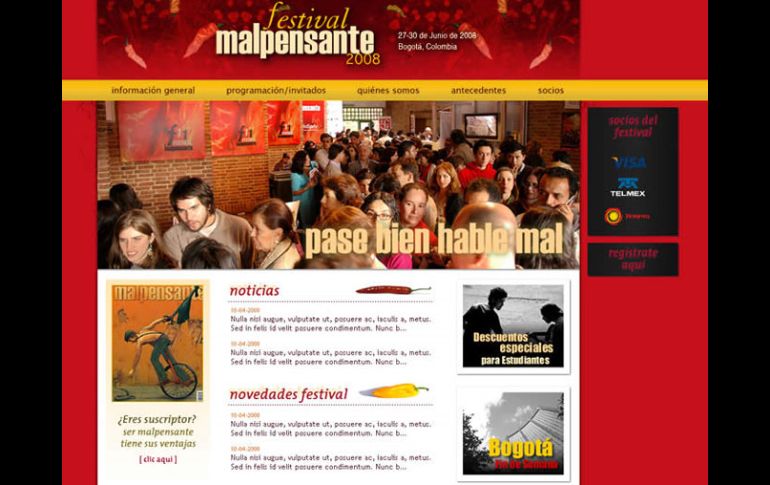 Cultura | El lugar de encuentro vuelve a ser el Colegio Anglo Colombiano de Bogotá Charla sobre libros ''robados y ajenos'' abre Festival Malpensante en Bogotá El lema de este año es ''Viva el ají'' y la invitación es ''Pase bien, hable mal'' Por: EFE 2 de julio de 2010 - 17:06 hs El festival dura cuatro días. ESPECIAL / BOGOTÁ, COLOMBIA (02/JUL/2010).- Una charla sobre libros "robados y ajenos", aquellos que nunca vuelven a quien los prestó, abre hoy en Bogotá la quinta edición del Festival Malpensante, que tiene este año entre sus invitados al escritor español Enrique Vila-Matas y al historiador estadounidense Thomas Cahill. Los escritores Alejandra Costamagna (Chile), Guillermo Martínez (Argentina) y Ricardo Silva Romero (Colombia) conversarán en la Biblioteca Luis Ángel Arango de Bogotá de los libros que tienen en sus estantes "como evidencia de robos descarados", según los organizadores de este festival cultural. El lema de este año, como explica Andrés Hoyos, director de la revista El Malpensante, es "Viva el ají" y la invitación es "Pase bien, hable mal". El lugar de encuentro vuelve a ser, como en ediciones anteriores, el Colegio Anglo Colombiano de Bogotá, donde habrá lugar para hablar y aprender de poesía, periodismo, historia, ciencia, economía, fotografía y cine, con zona gastronómica incluida y la presencia de 20 invitados internacionales y otros 25 nacionales. La oferta del festival incluye una exposición del arquitecto colombiano Rogelio Salmona, fallecido en 2007, y una selección de las mejores ilustraciones publicadas en El Malpensante en los 14 años de vida de la revista. También se podrán ver en los cuatro días que dura el festival, las obras de la fotógrafa de rock Nora Lezano (Argentina) y la reconocida revista literaria El Librero lanzará su edición para Colombia. Y otra de las iniciativas más interesantes de esta edición será la denominada "panadería musical", un laboratorio sonoro que mezclará ritmos tradicionales colombianos con nuevos sonidos y con las voces de las lenguas "picantes" invitadas al festival. Temas Literatura Escritores Libros Lee También "Lo que no quería era ser nadie": Premio Nobel de Literatura Mariana Etchegaray escribe “Hasta donde suene mi voz” László Krasznahorkai: Libros para adentrarse al mundo del nuevo Nobel de Literatura ¿Cuánto cuestan y dónde comprar los libros del Nobel de Literatura 2025? Recibe las últimas noticias en tu e-mail Todo lo que necesitas saber para comenzar tu día Registrarse implica aceptar los Términos y Condiciones