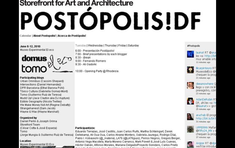 Cultura | El foro se titula ''Postópolis'' Diseñadores y arquitectos de varios países analizarán el entorno urbano en DF En esta ocasión el encuentro se desarrollará del 8 al 12 de junio en el patio del Museo Experimental El Eco Por: EFE 7 de junio de 2010 - 18:31 hs El ejecutivo consideró actualmente que los blogs están teniendo más influencia que las revistas. ESPECIAL / CIUDAD DE MÉXICO (07/JUN/2010).- Diez diseñadores, arquitectos y urbanistas de varios países analizarán por Internet, y por medio de sus "blogs", los avances y retos que plantea el entorno urbano de Ciudad de México, informaron hoy los organizadores del Foro Postópolis. El Foro Postópolis, que cumple su tercera edición, es organizado cada año por la galería neoyorquina de diseño Storefront for Art and Architecture en asociación con el Museo Experimental El Eco, la página de Internet Tomo.mx y la revista italiana de diseño Domus Magazine. En esta ocasión el encuentro se desarrollará del 8 al 12 de junio en el patio del Museo Experimental El Eco, ubicado en una zona céntrica de la capital mexicana, y al mismo asistirán, además, reconocidos artistas, expertos en plástica, urbanismo y buzos que trabajan en los drenajes de esta capital, de nueve millones de habitantes. Todos ellos, agregaron los organizadores, realizarán una "radiografía completa" de la ciudad. Durante este encuentro se desarrollará una serie de discusiones, entrevistas, presentaciones, paneles, películas y otras actividades que estarán encabezadas por músicos, restauradores de arte, curadores, diseñadores y arquitectos de Los Ángeles, Nueva York, Turín, Barcelona y Londres, explicaron sus organizadores en rueda de prensa. El directivo de la galería neoyorquina de diseño Storefront for Architecture & Design, Joseph Grima, indicó que esta plataforma busca "fusionar así el acercamiento informal e interdisciplinario que provee Internet con la interacción cara a cara de estos personajes". La pasada edición se llevó a cabo en la azotea del Standard Hotel en Los Ángeles, donde según sus organizadores se logró un espacio para efectuar conexiones inesperadas entre "blogueros", arquitectos, diseñadores, urbanistas, científicos. Grima defendió este proyecto al asegurar que "todos los días es importante reunir a una serie de personas desparramadas por el mundo para conversar entre ellas, lanzar lluvias de ideas, "bloguear" y hacer que la escritura en línea sea accesible al público". Temas Artes Plásticas Arquitectura Lee También Pequeñas grandes aventuras en las Fiestas de Octubre La UdeG celebra centenario de su refundación con un homenaje a sus figuras destacadas El Festín de los Muñecos cumple 20 años; anuncian el cierre de un ciclo Cantos de tierra y exilio: Illapu vuelve a Guadalajara Recibe las últimas noticias en tu e-mail Todo lo que necesitas saber para comenzar tu día Registrarse implica aceptar los Términos y Condiciones
