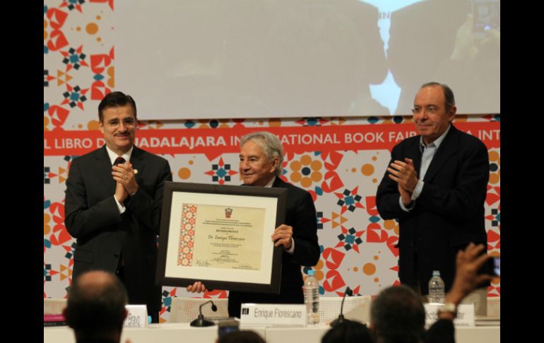 GUADALAJARA, JALISCO (02/DIC/2016).- El Patronato de la Feria Internacional del Libro de Guadalajara (FIL) reconoció la trayectoria del historiador veracruzano Enrique Florescano, quien ha sido un vínculo vivo del pasado y el presente de México a través de sus investigaciones que dan cuenta de un país cambiante y de contrastes. Es uno de los principales líderes de opinión de América Latina, un hombre que fundó la publicación Nexos y otros proyectos, además de haber sido director general del Instituto Nacional de Antropología e Historia.Durante el homenaje a Florescano y ante un auditorio muy nutrido, estuvieron presentes Raúl Padilla y Marisol Schulz, presidente del patronato y directora de la FIL; Tonatiuh Bravo Padilla, rector de la Universidad de Guadalajara, y los historiadores Jean Meyer, Lorenzo Meyer y Héctor Aguilar Camín. Padilla calificó a Enrique como un esclarecido y muy fecundo historiador, "con una trayectoria académica y científica que sorprende por su obra que es al mismo tiempo estimulante y abrumadora. Sus libros son portales en el sentido de conectarnos de ida y vuelta al pasado mexicano".Jean Meyer, reconoció que Florescano ha generado una obra inmensa que para para él podría compararse con la biblioteca de Babel. "Le agradezco su optimismo indescriptible, su trabajo y su amistad, Enrique muchas gracias".En su turno, Aguilar Camín dijo que conoció al historiador en 1969. "Enrique era un maestro de oficio y yo un estudiante de ocasión. Vestía con elegancia aristócrata y con una barbita de candado. Fue mi maestro de muchas maneras, me enseñó a leer la historia y me enseñó a trabajar, fue decisivo en mi vida intelectual y mi vida práctica. Fue mi maestro del siglo XVIII".Lorenzo conoció a Florescano desde hace 55 años. Lo tuvo como compañero y maestro a la vez. "Enrique mostró una gran generosidad hacia mí en los particular. Los últimos años hemos sido distantes, pero no porque lo que hayamos querido, sino porque la vida nos fue llevando a otras labores".Por su parte, Florescano recordó cómo la universidad nutrió su percepción del mundo: ”El recinto universitario cambió mi visión pueblerina del mundo y me convirtió en historiador profesional, sus aulas me enseñaron a enfrentar los temas y crucigramas de la historia , publicar revistas, publicar suplementos culturales, distintas tareas”.EL INFORMADOR / KIKE ESPARZA