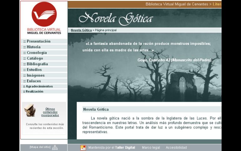 Cultura | El género fue ampliamente cultivado y leído en los inicios de Romanticismo hispano Inaugura Biblioteca Virtual Cervantes un espacio para la novela gótica La Biblioteca Virtual Miguel de Cervantes abrió un nuevo espacio en su portal dedicado a la novela gótica española Por: NTX 7 de abril de 2011 - 10:48 hs La novela gótica surgió en la literatura inglesa de la segunda mitad del XVIII con la publicación de “El castillo de Otranto”. ESPECIAL / MADRID, ESPAÑA (07/ABR/2011).- La Biblioteca Virtual Miguel de Cervantes inauguró hoy un portal dedicado a la novela gótica española, género ampliamente cultivado y leído en los inicios del Romanticismo hispano. El nuevo espacio de la Cervantes, dirigido por Miriam López Santos, investigadora de la Universidad de León, noroeste español, pretende dar a conocer un género complejo y rescatar para el gran público sus títulos más representativos, precisó en un comunicado la institución. Para su desarrollo, añadió, se ha realizado un ejercicio de arqueología literaria que permita sacar a la luz obras que han permanecido durante casi dos siglos sin reedición. La sección ofrece traducciones, entre ellas “Los Barones de Felsheim”, del francés Pigault-Lebrun, y “Oscar y Amanda” o “Los descendientes de la abadía”, de la inglesa Regina-Maria Roche, entre otras. Además, textos originales como la “Galería fúnebre de historias trágicas, espectros y sombras ensangrentadas”, en 12 volúmenes, de Agustín Pérez Zaragoza Godínez, y una selección de estudios sobre el género. El comunicado señaló que la novela gótica surgió en la literatura inglesa de la segunda mitad del XVIII con la publicación de “El castillo de Otranto”, de Horace Walpole, y su principal exponente fue Ann Radcliffe (1764-1823) , autora de “Los misterios de Udolfo” (1794) , entre otros títulos célebres. Expuso que los paisajes sombríos, los edificios en ruinas, los castillos lúgubres y las presencias sobrenaturales son protagonistas en la ambientación característica de este género que se expandió por otros países europeos, entre ellos España, donde comenzó a suscitar interés a finales de ese mismo siglo y a popularizarse entre escritores, lectores y editores. La Biblioteca Virtual Miguel de Cervantes ( www.cervantesvirtual.com) fue creada en 1999 por iniciativa de la Universidad de Alicante, Banco Santander y la Fundación Marcelino Botín, y se desarrolla en la actualidad bajo la tutela de la Fundación Biblioteca Virtual Miguel de Cervantes. Temas Literatura Novela Páginas Web Lee También László Krasznahorkai: Libros para adentrarse al mundo del nuevo Nobel de Literatura ¿Cuánto cuestan y dónde comprar los libros del Nobel de Literatura 2025? Otorgan Premio Nobel de Literatura al húngaro László Krasznahorkai Colocan a mexicana entre las favoritas para el Nobel de Literatura 2025 Recibe las últimas noticias en tu e-mail Todo lo que necesitas saber para comenzar tu día Registrarse implica aceptar los Términos y Condiciones