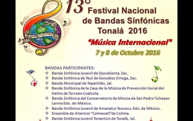 GUADALAJARA, JALISCO (06/OCT/2016).- El viernes 7 y sábado 8 de octubre se llevará a cabo el 13vo Festival Nacional de Bandas Sinfónicas Tonalá 2016. El festival es único en el estado de Jalisco y estárá a cargo del Maestro Manuel Cerros Guevara.En un comunicado de prensa señalan que el festival tendrá la participación de ocho bandas sinfónicas del interior de la República Mexicana como Zacatecas, Coahuila, Estado de México, Colima y Jalisco.El primer día se espera un desfile por las principales calles de Tonalá y para cerrar, el sábado a las 18:00 horas se presentarán todos los músicos conformando una Banda Sinfónica Monumental con 300 músicos que interpretarán juntos un programa de Música Internacional.