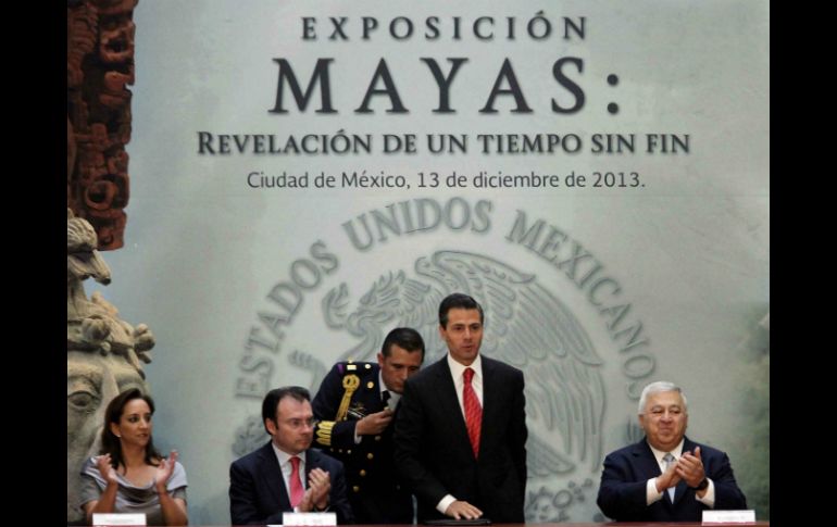 Se trata de "la muestra más importante que se haya presentado la cultura maya", afirmó en la inauguración el presidente Enrique Peña Nieto, quien destacó que la exposición incluye más de un centenar de piezas aportadas por Guatemala. "Mayas: Revelación de un tiempo sin fin" estará abierta hasta el próximo 27 de abril en el Palacio Nacional, ubicado en el centro histórico de la ciudad, después será llevada a Brasil y posteriormente a Francia, precisó. La muestra está integrada por urnas, incensarios, cerámica, estelas, dinteles, máscaras funerarias de jade y dos entierros con sus ofrendas, además de una cruz atrial, huipiles y otros objetos que aluden a las épocas colonial y contemporánea. Varias de las piezas son inéditas, representativas del área maya, casi 300 mil kilómetros cuadrados que abarcan el sureste de México, Belice, Guatemala, El Salvador y parte de Honduras, desde el periodo Preclásico Temprano (2500 a.C.) hasta la actualidad. Son 479 obras de calidad excepcional que reflejan la capacidad creadora, la sensibilidad estética y la perfección lograda por los mayas, señaló la curadora de la exposición, Mercedes de la Garza. "Todas sus creaciones tuvieron finalidades religiosas, políticas o sociales; eran piezas encargadas por los gobernantes, sobre todo de carácter ritual, para ser colocadas en los entierros a manera de ofrenda", explicó. Las piezas están ordenadas por temas con el fin de mostrar, además de su valor estético, las formas de vida, organización sociopolítica, la conciencia histórica, religiosidad y cosmovisión de los mayas, dijo el Instituto Nacional de Antropología e Historia (INAH). La exhibición arranca con el Tablero del Trono del Templo XXI de Palenque, "una de las expresiones plásticas más excelsas del arte maya" y está divida en varias secciones. La primera aborda la relación de los mayas con los animales y las plantas, muchas de carácter sagrado y con cualidades psicoativas que fueron esenciales en los ritos chamánicos, e incluye representaciones plásticas de flora y fauna del Preclásico (2500 a.C.) y Clásico (250-900 d.C.). El segundo modulo muestra a la sociedad maya en sus diversos aspectos, con énfasis en las ofrendas, indumentaria, ornamentos corporales y costumbres alimenticias.La tercera sección reúne elementos arquitectónicos, escultóricos y pictóricos de áreas ceremoniales de algunas de las grandes urbes mayas, "entre ellas la arquitectura de la ciudad de Chincultik, en Chiapas, por la belleza de sus dinteles", indicó De la Garza. Otro módulo está dedicado a las inscripciones de tipo astronómico y calendárico en piedra y estuco, con sus lecturas epigráficas, así como a vasijas y otros objetos con representaciones cosmológicas. La exhibición también muestra la historia de los gobernantes mayas a través de inscripciones jeroglíficas que dejaron plasmadas en estelas y otras piezas, así como sus ideas religiosas representadas en cerámicas, esculturas, urnas, incensarios. "Se exhiben dos entierros completos, tal como se encontraron, y un conjunto de ofrendas de un entierro real de la ciudad de Balamkú, en Campeche, junto con máscaras funerarias de jade, que se han hallado en Calakmul y otros sitios prehispánicos", señaló la curadora. Otra sección está dedicada a los mayas coloniales con piezas del periodo virreinal y otra más a los contemporáneos, de quienes se exhiben huipiles, tambores y otros objetos de su vida cotidiana. "Escogimos tanto piezas emblemáticas como otras que nunca se han exhibido, que le dan gran variedad a la exposición", que reúne obras del Museo Nacional de Antropología y otros de la región maya de México, así como de Guatemala.