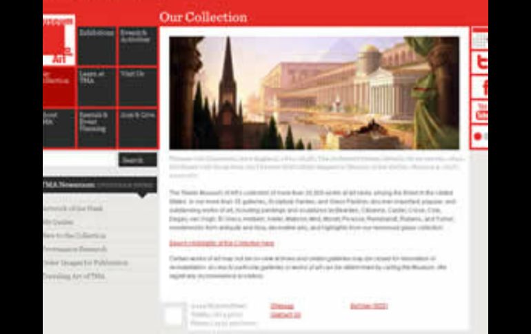 Cultura | Las obras que resguarda el inmueble podrán ser apreciadas en su página de internet Museo de Arte de Toledo ofrece recorrido virtual por su acervo Las obras que resguarda el inmueble podrán ser apreciadas en su página de internet Por: NTX 26 de junio de 2011 - 15:40 hs Los usuarios pueden navegar por la colección y buscar objetos por título, artista, material, fecha o tipo. ESPECIAL / WASHINGTON, EU (26/JUN/2011).- Muestra de su incursión a las dinámicas tecnológicas modernas, el Museo de Arte de Toledo (TMA, por sus siglas en inglés), ha puesto a la disposición en la red alrededor de 300 piezas que figuran dentro de su acervo, para que puedan ser apreciadas a través del enlace eMuseum situado en su página web. "Las obras maestras de la colección online representan más de un siglo de coleccionismo", declaró el director de la institución, Brian Kennedy. Añadió que 'la digitalización de esta primera selección de 300 obras es una iniciativa que amplía y facilita el acceso a nuestra colección, tanto al público que planea una visita, como al que no puede visitarnos en persona'. Tras este primer paso, aseguró el funcionario, el siguiente proceso de digitalización incluirá la valiosa colección de cristal, de renombre mundial, que el TMA espera ofrecer online la próxima primavera, coincidiendo con la celebración en Toledo, España, de la conferencia internacional de la Glass Art Society. Así, mediante esta plataforma, ahora los usuarios ya pueden navegar por la colección y buscar objetos por título, artista, material, fecha o tipo. Cada entrada ofrece una descripción extensa de la obra y, en muchos casos, las imágenes se pueden ampliar en una visualización muy detallada. De acuerdo con los últimos informes del portal del recinto, la colección virtual está organizada por áreas geográficas y épocas. Núcleos que facilitaran la navegación de los amantes del arte. Algunas de estas secciones están dedicadas al arte Americano y Europeo de entre los siglos XVII al XXI; al arte de Africa, Asia y Medio Oriente, así como también al arte del antiguo Mediterráneo, la Edad Media y el Renacimiento. Cada sección, como ocurre en las salas del propio museo, agrupa pinturas, esculturas, artes decorativas, joyas, muebles, grabados y fotografías. Los fondos del TMA incluyen más de 30 mil obras de arte, entre pinturas americanas y europeas, como antiguas obras griegas, romanas y egipcias, arte asiático y africano, además de arte medieval, decorativo, gráfico, moderno y contemporáneo. Según la crítica es una de las mejores colecciones permanentes de Estados Unidos, y cuenta con firmas destacadas, entre las que sobresalen las de Bearden, Cézanne, Calder, Close, Cole, Degas, Van Gogh, El Greco, Holbein, Kiefer, Matisse, Miró, Monet, Picasso, Rembrandt, Rubens, Canaletto y Turner, entre otros. Temas Internet Museos Patrimonio Recibe las últimas noticias en tu e-mail Todo lo que necesitas saber para comenzar tu día Registrarse implica aceptar los Términos y Condiciones