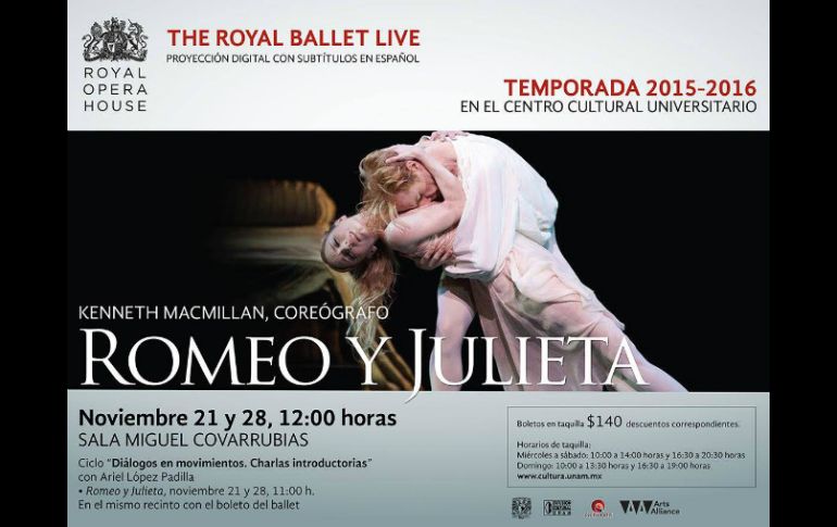 Cultura | La pieza coreográfica se presentará en más de mil 800 pantallas en todo el mundo The Royal Opera House proyectará 'Romeo y Julieta' en la UNAM La pieza coreográfica se presentará en más de mil 800 pantallas en todo el mundo Por: NTX 17 de noviembre de 2015 - 17:16 hs El público mexicano podrá disfrutar esta temporada que presentará a seis ballets y seis óperas. FACEBOOK / Cultura.UNAM.pagina CIUDAD DE MÉXICO (17/NOV/2015).- Como parte de su temporada de proyecciones internacionales 2015-2016, The Royal Opera House presentará "Romeo y Julieta", a cargo de The Royal Ballet, en más mil 800 pantallas en todo el mundo; los sábados 21 y 28 de noviembre llegará a la Sala Miguel Covarrubias, del Centro Cultural Universitario (CCU). La pieza coreográfica original de Kenneth MacMillan (1929-1992), que este año cumple su 50 aniversario, tendrá como sede el escenario de The Royal Opera House en el Convent Garden de Londres, informó Difusión Cultural de la Universidad Nacional Autónoma de México (UNAM) en un comunicado. Detalló que "Romeo" será interpretado por el bailarín australiano Steven McRae, mientras que la bailarina estadounidense Sarah Lamb será la encargada de interpretar a "Julieta". Con una vasta producción que incluye vestuarios de época que refleja la vida de Verona, Italia, el montaje regresa a los escenarios 50 años después de su estreno. El ballet, diseñado por Nicholas Georgiadis (1923-2001) con la partitura de Sergei Prokofiev (1891-1953), incluye luchas a espada y la trágica historia de amor que se desarrollan en diferentes lugares como el Palacio de los Capuletos o el ya famoso balcón donde la pareja concreta su amor. Este montaje fue adaptado especialmente para que el público disfrutara de él en pantalla. Sobre esto, la esposa del coreógrafo, Lady MacMillan comentó: "Kenneth fue un apasionado del cine, su pasión hacia esa disciplina se refleja en sus puestas en escena que se disfrutan de manera excelente en la pantalla". "Su creación de personajes buscaba ser realista y en un ballet como Romeo y Julieta, el amor y la pasión serán íntimos en la pantalla", añadió. Como una iniciativa de CulturArte y la Coordinación de Difusión Cultural de la UNAM, el público mexicano podrá disfrutar esta temporada que presentará a seis ballets y seis óperas, mediante un formato diferente que llevará las artes escénicas y la cultura de los mejores escenarios a los espectadores. Temas Artes Escénicas UNAM Danza Ballet Lee También El Festín de los Muñecos cumple 20 años; anuncian el cierre de un ciclo Cantos de tierra y exilio: Illapu vuelve a Guadalajara Aficionados protagonizan pelea en el Pumas vs Chivas | VIDEO Esta es la posición de Chivas en la tabla general de la Liga MX Recibe las últimas noticias en tu e-mail Todo lo que necesitas saber para comenzar tu día Registrarse implica aceptar los Términos y Condiciones