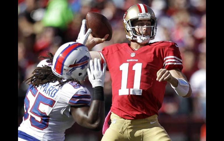 Deportes | San Francisco gana 45-3 con gran actuación de Smith y Gore 49ers vapulean a los Bills San Francisco gana 45-3 con gran actuación de Smith y Gore Por: AP 7 de octubre de 2012 - 19:39 hs Alex Smith (11) tuvo su mejor actuación de la temporada con 303 yardas. AP / SAN FRANCISCO, CALIFORNIA (07/OCT/2012).- Alex Smith logró su mejor actuación con pases en la temporada al lanzar para 303 yardas y tres touchdowns, Frank Gore corrió para 106 yardas y una anotación, y los 49ers de San Francisco impusieron una marcha de franquicia con 621 yardas al aniquilar el domingo por 45-3 a los Bills de Buffalo. Michael Crabtree y Vernon Davis superaron cada uno las 100 yardas en recepciones para apoyar a Smith, quien lanzó pases de anotación de 43, 28 y 10 yardas en un día en que por tercera vez en su carrera rebasó las 300 yardas por aire. Rian Lindell consiguió un gol de campo de 31 yardas en el primer período y luego San Francisco anotó los restantes 42 puntos para asestarle a Buffalo (2-3) su segunda bochornosa derrota al hilo. Ryan Fitzpatrick lanzó para 126 yardas y una intercepción, y los Bills corrieron para únicamente 89 yardas, y la mayor parte cuando el partido ya se les había ido de las manos. Temas NFL Futbol Americano Bills de Buffalo 49ers de San Francisco Recibe las últimas noticias en tu e-mail Todo lo que necesitas saber para comenzar tu día Registrarse implica aceptar los Términos y Condiciones