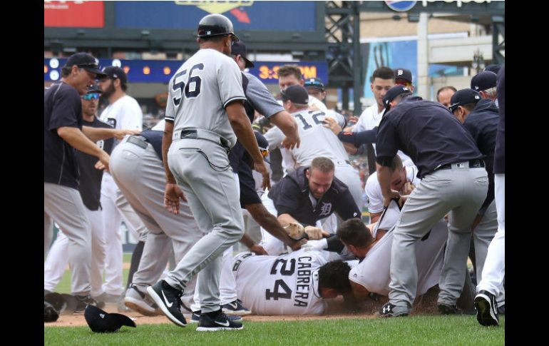DETROIT, ESTADOS UNIDOS (25/AGO/2017).- El venezolano Miguel Cabrera, de los Tigres, y el cátcher Austin Romine, de los Yankees, se enfrascaron en una pelea cerca del plato durante el primero de los tres altercados que vaciaron las bancas ayer durante la victoria de Detroit por 10-6 sobre Nueva York.El cubano José Iglesias bateó tres imparables y remolcó cuatro carreras por los ganadores en un duelo en que cinco jugadores fueron expulsados, al igual que ambos managers y el entrenador de banca de los Yankees.Justin Upton y James McCann conectaron cuadrangular por Detroit, y el dominicano Gary Sánchez también bateó un vuelacerca por los Yankees, en un partido en que los umpires batallaron para mantener el orden. Se espera que ahora Grandes Ligas prepare suspensiones que podrían afectar especialmente a Nueva York, que sigue en la pelea por Playoffs.