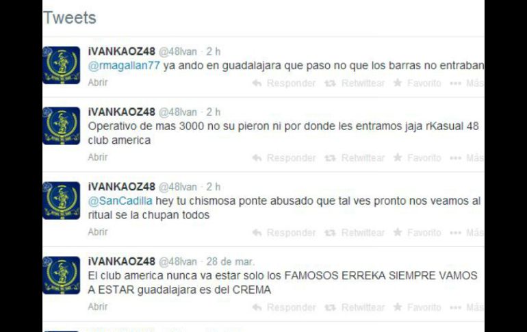 Deportes | El supuesto seguidor del América exhibe la hazaña en redes sociales Aficionado presume burlar operativo en el Omnilife El supuesto seguidor del América exhibe la hazaña en redes sociales; en el estadio todo luce sin contratiempos Por: EL INFORMADOR 30 de marzo de 2014 - 15:30 hs Aficionado del América presume mediante Twitter que burló la seguridad. ESPECIAL / GUADALAJARA, JALISCO (30/MAR/2014).- Un usuario de redes sociales que supuestamente pertenece a la porra americanista el 'El Ritual del Kaos', presume haber burlado el operativo de seguridad para instalarse en Guadalajara y acudir al Estadio Omnilife, pese a la consigna de las autoridades de no dejar entrar a barristas. "Operativo de más de tres mil (efectivos) y no supieron ni por dónde les entramos", expresa la cuenta de Twitter @48Ivan. Pese a este acontecimiento reportado en redes, EL INFORMADOR pudo constatar que el ingreso de aficionados al estadio se hace sin mayores contratiempos y en paz. Desde minutos antes del silbatazo inicial, el grupo de animación americanista comenzó con sus cánticos de aliento a su equipo. “Vamos, vamos América”, se escuchaba en una de las cabeceras del inmueble rojiblanco. En cuanto la policía dentro del coso se dio cuenta de la presencia de la porra águila la encapsuló con el fin de evitar cualquier desmán. Los integrantes del Ritual evitaron entrar con roces con la policía, de acuerdo con su vocero Eduardo “para demostrar que estamos con el equipo de una manera en paz y que el problema es el diálogo con los de seguridad”. A lo largo de la semana, esta barra azulcrema, que no es reconocida por la directiva de su equipo, aseguró su presencia en el Omnilife y burló todos los dispositivos de seguridad para presenciar en vivo el duelo ante el Guadalajara. A más de dos horas de que comiencen las acciones del partido, alrededor de cien aficionados ya se encontraban en las inmediaciones del Estadio Omnilife. Ayer sábado por la noche, integrantes de este grupo de animación azulcrema realizaron el viaje a Guadalajara con fin de presenciar en duelo entre Chivas y América a partir de las 19:00 horas. La consigna de las autoridades tapatías es la de evitar que grupos de 10 personas o más se junten en el inmueble rojiblanco. Temas Chivas Futbol Mexicano Águilas del América Estadio Chivas Clásico nacional Lee También “El diablo fuma”, una dura mirada al abandono infantil en el país Decomisan más de 400 mil litros de huachicol en cuatro Estados NFL: Resultados del Monday Night Football Futbol hoy 14 de octubre de 2025: ¿Dónde ver los partidos en vivo? Recibe las últimas noticias en tu e-mail Todo lo que necesitas saber para comenzar tu día Registrarse implica aceptar los Términos y Condiciones