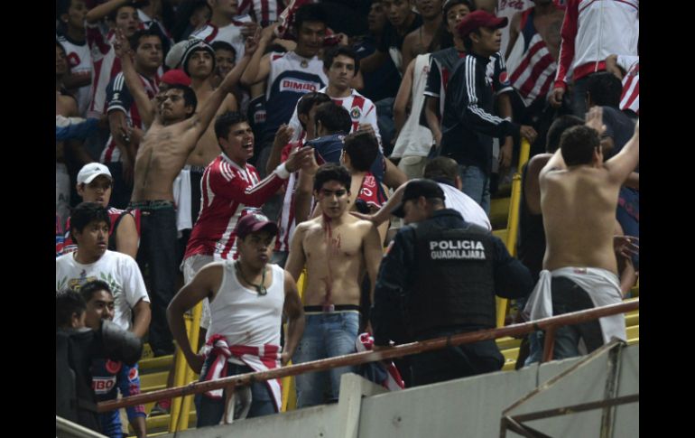 Deportes | La Fiscalía informa que los 19 detenidos incurrieron en delitos graves Aficionados violentos de Chivas no alcanzan fianza La Fiscalía informa que los 19 detenidos incurrieron en delitos graves Por: EL INFORMADOR 24 de marzo de 2014 - 13:38 hs La trifulca en la tribuna del Jalisco manchó el Clásico entre Chivas y Atlas. MEXSPORT / GUADALAJARA, JALISCO (24/MAR/2014).- Por los delitos de lesiones, resistencia de particulares y daños a las cosas, están siendo investigados los 19 fanáticos del equipo Guadalajara que fueron detenidos, tras el clásico tapatío de futbol, celebrado durante el fin de semana, en el Estadio Jalisco. Jorge Villaseñor, vocero de la Fiscalía General del Estado ( FGE) informó que los detenidos están siendo investigados por los delitos mencionados y lo que pueda resultar. "Se encuentran en estado de investigación (...) y lo que más encuentre el Ministerio Público, una vez agotada la investigación", dijo el funcionario de la FGE. Entre los detenidos, se encuentran ocho personas de Guadalajara, cuatro de Zapopan, cuatro del Distrito Federal, dos del Estado de México, y una de la ciudad de Pachuca. A ellos, se les vence el término constitucional en los primeros minutos de este martes y podrían ser puestos a disposición de un Juzgado, donde se decidirá su situación jurídica. "El Ministerio Público, se encuentra en la etapa de investigación (...) allegándose todos los elementos, recabándose todas las declaraciones, tanto de los lesionados, como de los detenidos para en su oportunidad consignarlos al Juzgado correspondiente", explicó el vocero de la FGE. Durante la " trifulca" fueron 20 elementos de la Policía de Guadalajara que resultaron heridos, y cuatro de ellos, con lesiones graves, y que su heridas tardan más de 15 días en sanar, motivo por lo que no los aficionados no alcanzan fianza. Por otra parte, el vocero, mencionó que los representantes legales del Estadio Jalisco, tendrán que presentar una denuncia por los daños que pudieron haberse registrado durante la pelea. EL INFORMADOR / OMAR RUVALCABA Temas Chivas Futbol Mexicano Clásico Tapatío Policía de Guadalajara Estadio Jalisco Liga MX Fiscalía de Jalisco (FGE) Recibe las últimas noticias en tu e-mail Todo lo que necesitas saber para comenzar tu día Registrarse implica aceptar los Términos y Condiciones