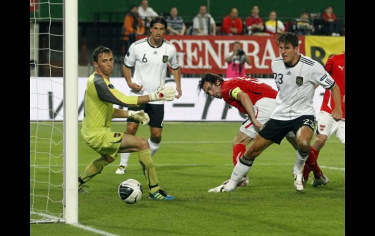 Deportes | El delantero Mario Gómez marcó un doblete, consiguiendo un marcador de 2-1 Alemania vence a Austria camino a Eurocopa El delantero Mario Gómez marcó un doblete, consiguiendo un marcador de 2-1 Por: REUTERS 3 de junio de 2011 - 15:17 hs Mario Gómez abre el marcador en favor de Alemania, tras marcar ante Austria. AP / VIENA, ITALIA (03/JUN/2011).- El delantero Mario Gómez marcó un tanto en el final para sumar un doblete y permitirle a la selección alemana de fútbol vencer 2-1 a Austria y mantener su marcha perfecta en la eliminatoria a la Eurocopa 2012. Alemania, que suma 18 puntos en seis partidos, abrió el marcador por intermedio de Gomez a los 44 minutos a la salida de un tiro de esquina. Austria igualó a los 50 con un gol de Arne Friedrich en contra de su propia valla. Austria se mostró más peligroso hasta el final del partido, pero el visitante se impuso con el gol de Gomez en el último minuto de cabeza tras un centro de Philippe Lahm. Temas Futbol Internacional Austria Selección de Alemania Eurocopa 2012 Recibe las últimas noticias en tu e-mail Todo lo que necesitas saber para comenzar tu día Registrarse implica aceptar los Términos y Condiciones