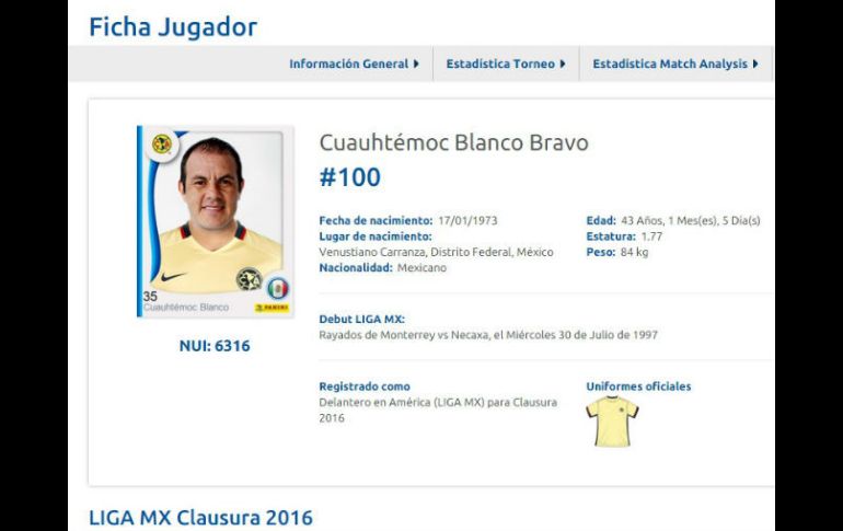 Deportes | El veterano aparece con el número '100' en honor al centenario del equipo América registra a Cuauhtémoc Blanco como jugador El veterano aparece con el número '100' en honor al centenario del equipo Por: SUN 22 de febrero de 2016 - 14:03 hs En el partido ante Monarcas, 'Cuau' se despedirá de la afición Águila. ESPECIAL / Liga MX CIUDAD DE MÉXICO (22/FEB/2016).- Tras dejar ir puntos en casa por el Clásico Joven, América no merma sus ánimos y prepara una sorpresa con el registro oficial de un nombre más en su plantilla de delanteros: el veterano Cuauhtémoc Blanco. En el portal de la Liga MX aparece el perfil del “Cuau” como un atacante más de las Águilas, pero con el número 100, lo que refiere a los festejos del "Ame" por su centenario. "El próximo 05 de marzo del presente año, en el marco del partido de la fecha 9 del Torneo Clausura 2016 entre Club América y Morelia, en el Estadio Azteca, nuestro legendario goleador e ídolo, Cuauhtémoc Blanco Bravo, se despedirá de la afición azulcrema defendiendo por última vez nuestros colores", explicó el club en un comunicado. Temas Futbol Mexicano Cuauhtémoc Blanco Águilas del América Homenaje Liga MX Clausura 2016 Lee También “El diablo fuma”, una dura mirada al abandono infantil en el país NFL: Resultados del Monday Night Football Futbol hoy 14 de octubre de 2025: ¿Dónde ver los partidos en vivo? Javier Aguirre asegura que realizará siete u ocho cambios ante Ecuador Recibe las últimas noticias en tu e-mail Todo lo que necesitas saber para comenzar tu día Registrarse implica aceptar los Términos y Condiciones