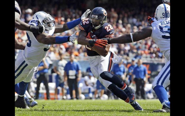 Deportes | Cutler y Chicago amansan a los Potros 41-21 en el arranque de temporada Andrew Luck pierde su primer encuentro Cutler y Chicago amansan a los Potros 41-21 en el arranque de temporada Por: AP 9 de septiembre de 2012 - 16:14 hs Forte, (centro) tuvo un buen encuentro para el ataque terrestre de los Osos. AP / CHICAGO, ILLINOIS (09/SEP/2012).- Jay Cutler registró 333 yardas y dos touchdowns, mientras que Michael Bush anotó un par de veces con acarreos y los Osos de Chicago estropearon el debut de Andrew Luck al vencer el domingo 41-21 a los Potros de Indianápolis. Brandon Marshall atrapó nueve pases para 119 yardas y un touchdown para los Osos. Además, Matt Forte avanzó 80 por tierra con una anotación, con 40 yardas tras pases atrapados. Luck, primera selección del draft y sucesor de Peyton Manning, cumplió su primer partido en la NFL completando 23 de 45 pases para 309 yardas. Conectó con Donnie Avery para un pase de cuatro yardas al inicio del último cuarto. Pero fue interceptado tres veces, dos por Tim Jennings. Temas NFL Futbol Americano Potros de Indianápolis Osos de Chicago Lee También La NFL suspende a Brian Branch por golpear a jugador de Chiefs NFL: Resultados del Monday Night Football Futbol hoy 14 de octubre de 2025: ¿Dónde ver los partidos en vivo? Javier Aguirre asegura que realizará siete u ocho cambios ante Ecuador Recibe las últimas noticias en tu e-mail Todo lo que necesitas saber para comenzar tu día Registrarse implica aceptar los Términos y Condiciones