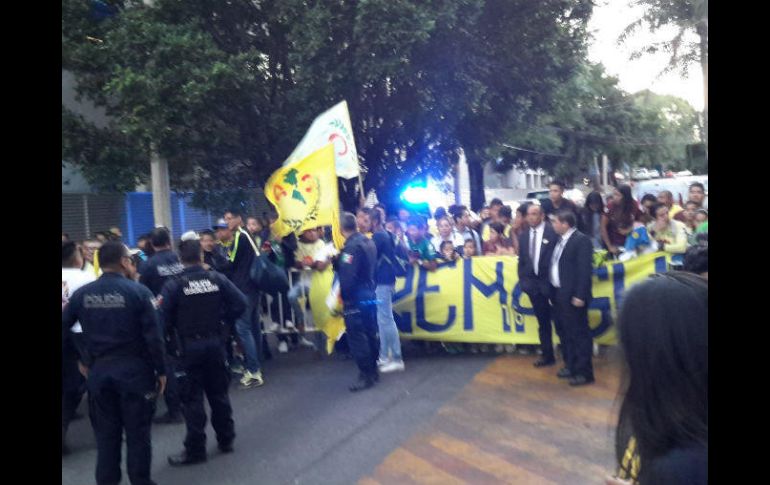 GUADALAJARA, JALISCO (17/FEB/2017).- Sabedores de que su equipo no pierde en el Estadio Chivas desde hace más de cinco años, decenas de aficionados al América recibieron este viernes a las Águilas para hacer sentir a sus jugadores como en casa.Cerca de 70 seguidores azulcremas fueron los que se dieron cita a las afueras del hotel de concentración para recibir a un cuadro capitalino que si bien tiene las estadísticas en su contra, cuenta a su favor con el orgullo de haber eliminado al odiado rival en Liga durante todo el 2016.Por lo anterior, y gracias al recuerdo fresco de que hace unos meses estaban en la final del torneo local y se encontraban en Japón peleando por el Mundial de Clubes, a las Águilas les sobró cariño a su arribo a territorio tapatío.Pasadas las 19:00 horas fue cuando el autobús de los azulcremas se asomó escoltado por la Policía Municipal de Guadalajara. Con el conjunto de Coapa ya cerca, los cánticos de los presentes arreciaron y las banderas ondearon con más fuerza para saludar a quienes este sábado tendrán la obligación de defender al americanismo.El primero en bajar del autobús fue Ricardo Peláez, quien aún con su cargo de presidente deportivo del equipo no dudó en atender a los aficionados para regalarles una foto, una firma o simplemente un apretón de manos.El defensa Paolo Goltz fue sin duda quien más se dejó arropar por su gente al detenerse por varios minutos para complacer a los que ahí le pedían un triunfo más ante los rojiblancos.Contrario a Peláez y Goltz, la mayoría del plantel bajó del transporte para encaminarse rápidamente al hotel. Ricardo Antonio La Volpe hizo lo mismo y al final, la serenata continuó para hacerle saber a sus jugadores que mañana es el día ideal para retomar el rumbo en el Clausura.SABER MÁSUna parte de los aficionados que recibieron al América en Guadalajara hicieron el viaje desde California, Estados Unidos.EL INFORMADOR/DIEGO REOS