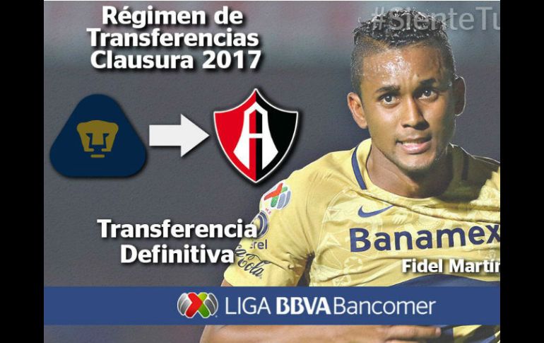 GUADALAJARA, JALISCO (14/DIC/2016).-Esta tarde se hizo oficial por parte de los Pumas, que Fidel Martínez, delantero ecuatoriano pasará en compra definitiva a los Rojinegros del Atlas, por lo que la directiva cumplió su promesa y reforzó su delantera y hará dupla con Matías Alustiza, quien fue presentado el martes en La Madriguera.Fidel dejó de formar parte del plan que tiene Francisco Palencia para los Pumas en el Clausura 2017 y fue negociado para que vuelva a la ciudad de Guadalajara, en donde militó con los Leones Negros de la UdeG, equipo con el cual descendió.También conocido como “Alegría”, Fidel Martínez ya jugó con Xolos de Tijuana en su llegada al futbol mexicano, pero previamente jugó para Caribe Junior de Ecuador, equipo con el cual debutó, así como el Deportivo Quito de su país, conjunto en donde coincidió con quien será su compañero en el ataque rojinegro, Matías Alustiza. EL INFORMADOR / JAVIER ROBLES