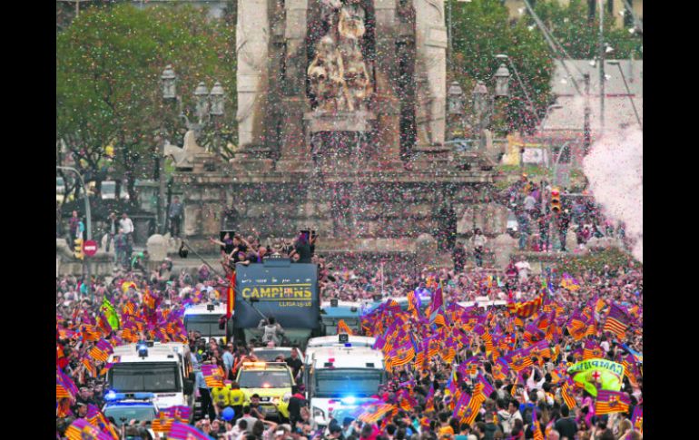 Deportes | Liga de España. Festejo Barcelona rinde homenaje a sus campeones Miles de aficionados asistieron al desfile del equipo, que recorrió las principales calles de la ciudad en un autobús Por: EL INFORMADOR 15 de mayo de 2016 - 23:25 hs Celebración. Los jugadores del FC Barcelona festejan la consecución del título de Liga en las calles de Barcelona. EFE / BARCELONA, ESPAÑA (16/MAY/2016).- Tras lograr el sábado el título de la Liga española, los jugadores del FC Barcelona participaron ayer en una “Rúa”, un desfile en un autobús por las calles de Barcelona, donde varios miles de aficionados les esperaban. Tras salir del puerto, los campeones de España se fotografiaron delante del autobús, que tenía el eslogan en catalán “Lo hemos demostrado”, antes de subir la Avenida Paralelo. Fue el defensa Gerard Piqué quien colocó el trofeo, adornado con cintas con los colores del club, azul y grana, delante del autobús. Alrededor del autobús, miles de aficionados agitaban sus banderas con los colores de Cataluña y del club y lanzaban confettis azules y granates. En la Avenida Paralelo, el uruguayo Luis Suárez, Pichichi de la Liga con 40 goles, mostraba su sonrisa debajo de unas gafas de sol. Otros jugadores como el brasileño Neymar, habían anudado en su cabeza bufandas con los colores de Cataluña. Entre los miles de aficionados, algunos desplegaban pancartas en homenaje al que fue jugador y entrenador del club, el legendario holandés Johan Cruyff, fallecido en marzo. Por otro lado, el Getafe cayó víctima de la presión y perdió 2-1 en su visita el Betis, una derrota que le condenó al descenso a la segunda división. Temas Futbol Español Futbol Internacional Barcelona Lee También ¿Dónde ver EN VIVO el partido de J13 Santos vs León? ¿Dónde ver EN VIVO el partido de J13 Toluca vs Querétaro? Liga MX: Horarios y canales de los partidos del 17 de octubre El “malabarista” de la Casa Blanca Recibe las últimas noticias en tu e-mail Todo lo que necesitas saber para comenzar tu día Registrarse implica aceptar los Términos y Condiciones