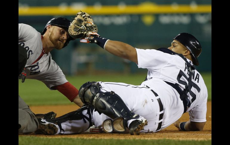 Deportes | Los Medias Rojas vencen 4-3 a los Tigres y ponen la serie de campeonato 3-2 Boston, a un triunfo del Clásico de Otoño Los Medias Rojas vencen 4-3 a los Tigres y ponen la serie de campeonato 3-2 Por: AP 17 de octubre de 2013 - 22:22 hs El receptor de Tigres Brayan Peña (d) choca con el árbitro de tercera base Rob Drake (i) y no alcanza a ponchar a Will Middlebrooks (c) EFE / DETROIT, ESTADOS UNIDOS (17/OCT/2013).- Un majestuoso jonrón de Mike Napoli abrió paso a un ataque inusitado de Boston en los albores del juego, para que los Medias Rojas superaran el jueves 4-3 a los Tigres de Detroit y se acercaran a un solo triunfo de la Serie Mundial. Junichi Tazawa volvió a dominar al venezolano Miguel Cabrera en un turno crucial, y Boston tomó una ventaja de 3-2 en la serie de campeonato. Los Medias Rojas volverán al Fenway Park para el sexto juego, previsto para el sábado. Max Scherzer lanzaría por los Tigres, frente a Clay Buchholz. Cabrera fue retirado en el plato en la primera entrada, lo que impidió un racimo de Detroit, y bateó para doble matanza ante el japonés Tazawa en la séptima entrada, cuando había corredores en las esquinas. Los Tigres anotaron una carrera gracias al roletazo, pero los Medias Rojas quedaron felices de que ese fuera todo el daño que les infligiera el venezolano. Napoli abrió un ataque de tres rayitas en el segundo acto, con un vuelacerca frente al venezolano Aníbal Sánchez, por todo el jardín central. Por los Medias Rojas, el dominicano David Ortiz de 4-1. Por los Tigres, los venezolanos Cabrera de 3-1 con una impulsada, Víctor Martínez de 3-1, Omar Infante de 1-0. El dominicano Jhonny Peralta de 4-1. Los cubanos Brayan Peña de 3-1 con una remolcada, José Iglesias de 3-1 con una anotada. Temas Beisbol MLB Medias Rojas de Boston Tigres de Detroit Lee También Dónde ver EN VIVO los juegos de MLB, HOY 10 de octubre Dodgers va a la Serie de Campeonato; Chicago fuerza a quinto juego Dónde ver EN VIVO los juegos de MLB, HOY 9 de octubre Resultados de las Series Divisionales: Azulejos elimina a los Yankees Recibe las últimas noticias en tu e-mail Todo lo que necesitas saber para comenzar tu día Registrarse implica aceptar los Términos y Condiciones