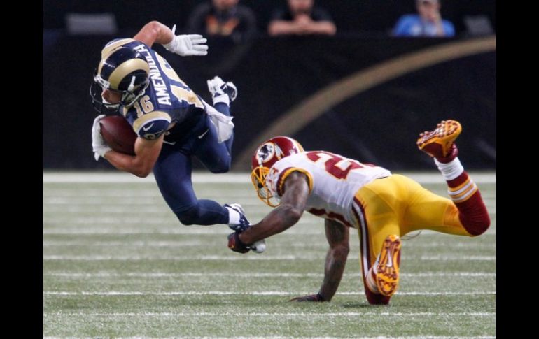 Deportes | Triunfan 31-28 ante los Pieles Rojas de Washington Bradford y Amendola llevan a Carneros a la victoria Bradford lanza para 310 yardas y tres anotaciones y Amendola captura 16 pases para 160 yardas Por: EFE 16 de septiembre de 2012 - 20:35 hs DeAngelo Hall, de los Pieles Rojas, taclea a Danny Amendola, de los Carneros, quien fue el jugador del partido. REUTERS / SAN LUIS, ESTADOS UNIDOS (16/SEP/2012).- La brillantez de la ofensiva encabezada por el mariscal de campo Sam Bradford y el receptor abierto Danny Amendola fue la clave que abrió el camino a los Carneros de San Luis al triunfo de 31-28 ante los Pieles Rojas de Washington, primero que consiguen bajo la dirección de su nuevo entrenador en jefe, Jeff Fisher. Bradford lanzó para 310 yardas y tres anotaciones y Amendola capturó 16 pases para 160 yardas, siendo la combinación perfecta en el ataque de los Carneros ante el mariscal novato Robert Griffin III de los Pieles Rojas (1-1), que sufrió su primera derrota. Los Carneros remontaron después que Fisher enviara al banquillo al corredor Steven Jackson por cometer un castigo de conducta antideportiva en el segundo cuarto. Griffin llevó a los Pieles Rojas a una ventaja 21-6, pero los Carneros vinieron de atrás gracias a las recepciones de Amendola, que fue el jugador del partido. El receptor empató el récord de la Liga Nacional de Fútbol Americano (NFL) de 12 recepciones en la primera mitad, y atrapó un pase de "touchdown" de una yarda que puso el marcador 21-13 al medio tiempo, lo que dio esperanza de remontadas a su equipo. En la segunda mitad Bradford envió pases de "touchdown" de 34 yardas al receptor abierto Brandon Gibson y de una yarda al "tight end" Matt Mulligan. Griffin logró dos anotaciones por tierra y envió un pase de "touchdown" para los Redskins, que se vieron sorprendidos por la reacción de los Carneros (1-1). Los Pieles Rojas tuvieron una oportunidad al final del partido, después que el esquinero DeAngelo Hall recuperara un balón suelto del corredor, Daryl Richardson, en la yarda 37 de Washington con 2.40 minutos por jugar. Sin embargo, el pateador Billy Cundiff se quedó corto en un intento de gol de campo de 62 yardas con 1.13 para que concluyese el partido. Temas NFL Futbol Americano Pieles Rojas de Washington Carneros de Los Ángeles Lee También Calendario de partidos de la J13 del Apertura 2025 Hirving Lozano confía en el proceso del Tri César Huerta destaca la competencia interna en la Selección Mexicana Futbol hoy 15 de octubre de 2025: ¿Dónde ver los partidos en vivo? Recibe las últimas noticias en tu e-mail Todo lo que necesitas saber para comenzar tu día Registrarse implica aceptar los Términos y Condiciones