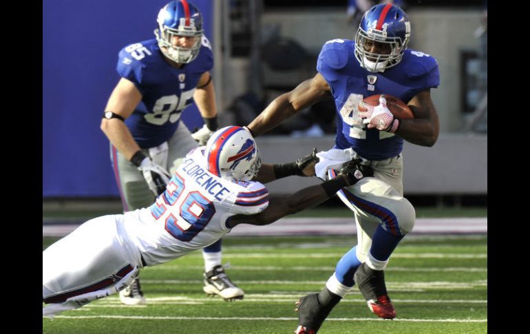 Deportes | Ayuda con tres avances a Gigantes, derrotan 27-24 a Buffalo Bradshaw anota tres touchdowns para NY Ayuda con tres avances a Gigantes, derrotan 27-24 a Buffalo Por: AP 16 de octubre de 2011 - 15:40 hs Ahmad Bradshaw (D) escapa lejos del jugador de los Bills Drayton Florence para concretar un touchdown. REUTERS / EAST RUTHERFORD, NUEVA JERSEY (16/OCT/2011).-Ahmad Bradshaw corrió para 104 yardas y tres touchdowns, Lawrence Tynes metió un gol de campo de 23 yardas que puso arriba a los Gigantes con 1:32 en el reloj y Nueva York derrotó el domingo 27-24 a los Bills de Buffalo. Bradshaw anotó con tres avances de una yarda y tuvo un acarreo de 30 que ayudó a preparar la patada ganadora de Tynes. Los Gigantes (4-2) repuntaron de una dura derrota ante Seattle el fin de semana pasado al limitar el domingo a los Bills (4-2) "que suelen anotar mucho" a sólo siete puntos en la segunda mitad. Ryan Fitzpatrick (21 pases completos en 30 intentos para 244 yardas) lanzó pases de touchdown de 60 yardas a Naaman Roosevelt y de nueve a Stevie Johnson, pero Jason Pierre-Paul bloqueó su último intento en cuarta oportunidad y cinco yardas por avanzar en la 25 de los Bills, acción que preservó la victoria. Fitzpatrick también sufrió dos intercepciones de Corey Webster, la última de las cuales dio inicio a la posesión del ovoide que derivó en la patada ganadora. Temas NFL Futbol Americano Gigantes de Nueva York Bills de Buffalo Recibe las últimas noticias en tu e-mail Todo lo que necesitas saber para comenzar tu día Registrarse implica aceptar los Términos y Condiciones