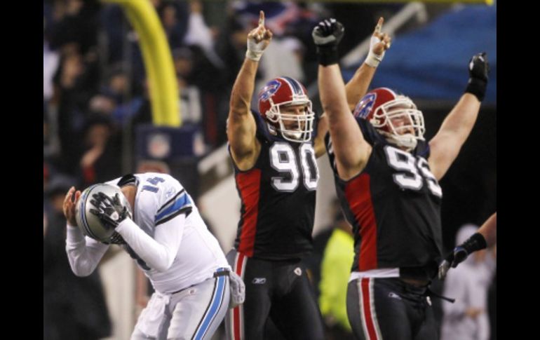 Deportes | Bills consiguieron su primer victoria de la temporada al vencer a los Leones 14 por 12 Buffalo gana por fin Bills consiguieron su primer victoria de la temporada al vencer a los Leones 14 por 12 Por: AP 14 de noviembre de 2010 - 15:42 hs Buffalo festeja su primer triunfo y Detroit se lamenta de la derrota. AP / ORCHARD PARK, NUEVA YORK (14/NOV/2010).- Fred Jackson anotó dos touchdowns y guió el domingo a los Bills de Buffalo a su primera victoria de la temporada al vencer 14-12 a los Leones de Detroit, que tuvieron el triste récord en la NFL de 25 derrotas seguidas fuera de casa. Jackson anotó con una zambullida de una yarda y una atrapada de 16 en un partido desangelado bajo la lluvia entre dos eternos perdedores. Buffalo (1-8) salió de lo que había sido su peor comienzo de campaña desde que perdió los 11 primeros en 1984. Los Leones (2-7) rompieron la marca que establecieron al perder 24 en fila como visitantes desde 2001-2003. Temas NFL Futbol Americano Bills de Buffalo Leones de Detroit Lee También El Oviedo recibe a los Periquitos Futbol hoy 17 de octubre de 2025: ¿Dónde ver los partidos en vivo? ¿Erick Gutiérrez y Roberto Alvarado regresan a la actividad ante Mazatlán? Realizan homenaje al cronista deportivo Roberto Guerrero Ayala Recibe las últimas noticias en tu e-mail Todo lo que necesitas saber para comenzar tu día Registrarse implica aceptar los Términos y Condiciones