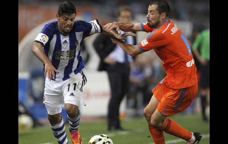 Deportes | El equipo de San Sebastián termina 1-1 ante Valencia Carlos Vela es titular con Real Sociedad, que empata ante Valencia El equipo de San Sebastián termina 1-1 ante Valencia en la sexta fecha de la Liga de España Por: NTX 28 de septiembre de 2014 - 15:01 hs El delantero mexicano recibe una tarjeta amarilla por empujar al argentino Otamendi. EFE / J. Herrera SAN SEBASTIÁN, ESPAÑA (28/SEP/2014).- El delantero mexicano, Carlos Vela, fue titular en el empate 1-1 como local de la Real Sociedad ante Valencia, en partido correspondiente a la sexta fecha de la Liga de España. Las acciones se abrieron al minuto 15 para los visitantes por parte de Carles Gil, quién disparó dentro del área de zurda para darle la ventaja a los "murciélagos". En el mismo primer tiempo, Sergio Canales igualó las acciones al 36'. El exjugador del Valencia mandó un centro que ninguno de sus compañeros remató y el balón se escabulló al fondo del marco defendido por el brasileño Diego Alves. En la segunda mitad del cotejo, los "blanquinegros" tuvieron la oportunidad de adelantarse, pero el defensa, Iñigo Martinez, evitó que el brasileño Filipe Augusto marcara el gol de la victoria para los valencianos. Por su parte, Carlos Vela, recibió una tarjeta amarilla por empujar al defensa argentino, Nicolás Otamendi, tras recibir una falta. Con el empate, los dirigidos por Jagoba Arrasate se mantienen en el lugar 14 con cinco unidades. Por otro lado, los comandados por el portugués Nuno Espirito se mantienen en el segundo sitio, detrás de Barcelona con 14 puntos. Temas Mexicanos en Europa Futbol Español Futbol Internacional Carlos Vela Valencia Recibe las últimas noticias en tu e-mail Todo lo que necesitas saber para comenzar tu día Registrarse implica aceptar los Términos y Condiciones