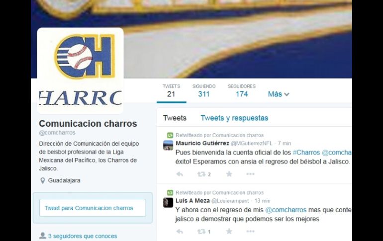 Deportes | En la cuenta ya se pueden ver varios tuits y destaca la interacción con sus seguidores Charros de Jalisco estrenan twitter En la cuenta ya se pueden ver varios tuits y destaca la interacción con sus seguidores Por: EL INFORMADOR 29 de mayo de 2014 - 19:36 hs La cuenta ya alcanza los 174 seguidores. ESPECIAL / GUADALAJARA, JALISCO (29/MAY/2014).- Los Charros de Jalisco estrenan su cuenta de Twitter ( @comcharros) medio por el cual darán a conocer las últimas noticias del nuevo integrante de Liga Mexicana del Pacífico. En la cuenta ya se pueden ver varios tuits y destaca la interacción que se tiene con sus seguidores. En el primer tuit que se posteó en la cuenta, se puede leer lo siguiente: "La Dirección de Comunicación de los Charros de Jalisco de Beisbol inaugura su canal de contacto por esta vía. Saludos desde Zapopan, México". La cuenta alcanza los 150 seguidores y en su perfil se puede leer: Comunicación Charros, Dirección de Comunicación del equipo de beisbol profesional de la Liga Mexicana del Pacífico, los Charros de Jalisco. Para saber El primer juego de los Charros de Jalisco se dará el próximo 10 de octubre, en el estadio de Atletismo ante Las Águilas de Mexicali, con lo cual se debutarán en el circuito de beisbol profesional de la Liga Mexicana correspondiente a la temporada de invierno 2014-2015 EL INFORMADOR / HÉCTOR NAVARRO Temas Beisbol Liga Mexicana del Pacífico Twitter Charros de Jalisco Lee También Dónde ver EN VIVO los juegos de MLB, HOY 11 de octubre ¿Cómo otros países han reducido el tabaquismo? Denuncia en su contra es para ocultar un fraude: Hermana de Omar "N" Protección Civil reabre el malecón de Puerto Vallarta Recibe las últimas noticias en tu e-mail Todo lo que necesitas saber para comenzar tu día Registrarse implica aceptar los Términos y Condiciones