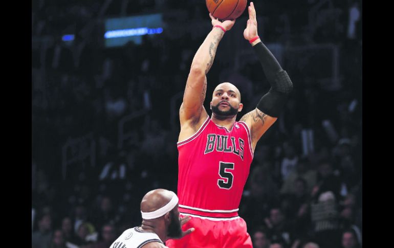 Carlos Boozer, de los Bulls de Chicago, dispara sobre la marca de Reggie Evans de los Nets de Brooklyn. AFP /