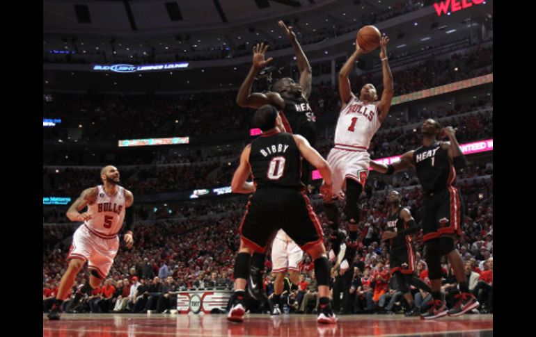 CHICAGO, ILLINOIS (15/MAY/2011).- Derrick Rose y Luol Deng salieron con las escopetas bien calibradas, y la banca de Chicago rindió más que la de Miami, para que los Toros vencieran al Heat este domingo 103-82 en el primer partido de la final de la Conferencia Este de la NBA.