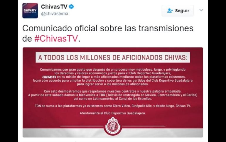 GUADALAJARA, JALISCO (08/ABR/2017).- Chivas madruga a varios aficionados y sorpende con una noticia bomba. En los primeros minutos del sábado anunció a través de sus redes sociales que ha llegado a un acuerdo con Televisa para que los partidos del Rebaño puedan transmitirse para México por el canal TDN, de televisión restringida; y para Latinoamérica a través de "Las Estrellas", además de tener la opción de seguir la transmisión por el servicio "on-demand" de Blim.El acuerdo entrará en vigor de inmediato y el juego de esta noche de sábado Guadalajara vs Puebla ya podrá verse a través de los canales de Televisa además de las opciones ya existentes como Claro Video, Cinépolis Klic y Chivas TV.Las reacciones de inconformidad no se hicieron esperar, y en la cuenta de @chivastvmx, decenas de aficionados comenzaron a reprochar la decisión del Club Guadalajara por la determinación de concretar este acuerdo e incluso piden la devolución del dinero que pagaron por el servicio en la plataforma.Los comunicados enviados tanto por Televisa como por Chivas TV, no aclaran si serán transmisiones distintas o sólo se replicará la señal producida por Chivas TV y tampoco si para la Zona Metropolitana de Guadalajara seguirá habiendo una restricción particular como sucedía cuando los partidos eran exclusivos del servicio Sky.Chivas TV asegura en su mensaje que el acuerdo se logró tras un proceso "muy meticuloso, largo y privilegiando los derechos y valores económicos", además de asegurar que respetan todos sus contratos y palabra empeñada.La televisora, por su parte, explica en su misiva: "Nos congratulamos que Chivas, como uno de los equipos con mayor popularidad en el futbol mexicano y con una exitosa trayectoria en competencias nacionales e internacionales, aumente su presencia en beneficio de la audiencia y de sus aficionados, eligiendo a Televisa Networks como el aliado estratégico en televisión para ello".Algunos comentarios de aficionados:@12CHIVAS: "Lo que no respetaron fue a la afición que contrato Chivas tv por su "exclusividad" por lo que se ve su palabra empeñada vale muy poco".@edgargcuevas: "Pésima noticia, estaban cambiando la forma de ver el fútbol"@IsselaC_: "Yo tengo el servicio de Chivas Tv y hasta ahora muy bien,pero da asco todo lo que huele a Televisa"@cobianlo: "Me van a regresar mi dinero yo que pague anual o como va a ser? Creo que se aprovecharon"@PacoPsicil: "Ya tenía Sky...y Bluetogo... para qué contratar CHIVASTV por un año? No importa la fiel afición.. lo más importante es el billete"Habían armado paquete para final de Copa MXApenas el jueves se anunció el ofrecimiento de un paquete para poder seguir la transmisión del partido final de Copa MX entre Chivas y Morelia y el partido de Liga, Chivas vs Puebla por un pago único de $150 pesos.Se dijo que antes de que se jugara el encuentro entre el Monterrey y Chivas, por la semifinal de Copa MX, la directiva tapatía ya había recibido dos propuestas para que abrieran su transmisión, pero ante todos los intentos Chivas cerró la puerta a cualquier negociación.