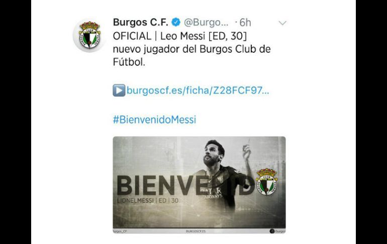 BURGOS, ESPAÑA (23/AGO/2017).- El Burgos CF, de la Segunda B española, se ha convertido en las últimas horas en protagonista en Twitter tras publicar anoche un mensaje en su cuenta oficial en el que anunciaba el fichaje de Leo Messi.El mensaje, que incluía un fotomontaje del propio jugador argentino a imagen y semejanza de los que utiliza el club para anunciar sus fichajes reales, se propagó por la red en cuestión de minutos y ha sido eliminado a primera hora de esta mañana, cuando el propio club ha desmentido la noticia.Eso sí, lo ha hecho con ironía, ya que todo ello formaba parte de una campaña planeada por el responsable de redes sociales del club mediante la que se pretendía generar movimiento en las redes."Nuestra intención era hacer un poco de humor", explica Sergio González, responsable de prensa del club, para lo que se echó mano de "un caso actual", como el supuesto "hackeo" que sufrió la cuenta oficial de Twitter del FC Barcelona días atrás.Así, el desmentido publicado por el Burgos CF también hace referencia a haber sido víctimas de un "hackeo" que no ha sido tal."Queríamos hacer humor sano, sin meternos con nadie ni faltar al respeto, y creemos que lo hemos conseguido, ya que el mensaje ha sido muy bien recibido en las redes", asegura González.Además, la campaña ha acabado cumpliendo su objetivo, ya que el mensaje lleva a estas horas "más de cinco mil retuits y más de tres mil 500 me gusta", lo que lo convierte en uno de los más exitosos de un perfil que actualmente cuenta con casi 16 mil 900 seguidores.