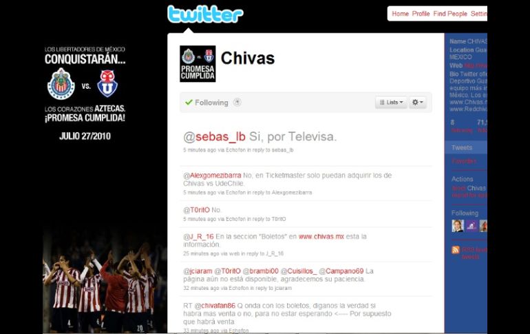 Deportes | La venta de boletos fluyó normalmente por una hora, después fue imposible Colapsa web de Chivas; no soportó entusiasmo de aficionados Aclaran que la venta de boletos para el partido inaugural se restablecerá en cuanto se repare la falla que ya lleva más de cuatro horas Por: EL INFORMADOR 20 de julio de 2010 - 11:43 hs La cuenta de Twitter de Chivas ha sido el principal canal de comunicación para aclaraciones después de la falla. ESPECIAL / GUADALAJARA, JALISCO (20/JUL/2010).- Tras haber anunciado que los boletos para la inauguración del nuevo estadio del Guadalajara, la directiva del Club, publicó esta mañana en su cuenta de Twitter un enlace para ingresar al sistema de compra de entradas para el partido contra el Manchester United el próximo 30 de julio. Sin embargo, a poco más de una hora de la venta de boletos el sistema colapsó, aunque a juzgar por las respuestas del Club a los aficionados, a través de su Twitter, algunos pensaron que los boletos se habían agotado, versión que fue desmentida por el administrador de la cuenta. Durante el tiempo que funcionó la página, poco más de una hora, incluso se "retwittearon" los mensajes de agradecimiento de los primeros aficionados que adquirieron sus entradas. Es destacable que a pesar de la falla en el sistema el ánimo no decae, al grado que hasta las 12:30 horas, ya suman más de cuatro mil visitas al enlace publicado durante la mañana. Al cumplirse cuatro horas de la falla, el Twitter de Chivas continúa publicando mensajes aclaratorios sobre el estado de la red y pide a los aficionados que tengan paciencia en tanto "los ingenieros siguen trabajando en restablecer el sistema". A continuación se describen las zonas y los costos de cada una en el Estadio Movistar: - - EL INFORMADOR / SERGIO RODRÍGUEZ Temas Internet Chivas Twitter Torneo Apertura 2010 Recibe las últimas noticias en tu e-mail Todo lo que necesitas saber para comenzar tu día Registrarse implica aceptar los Términos y Condiciones
