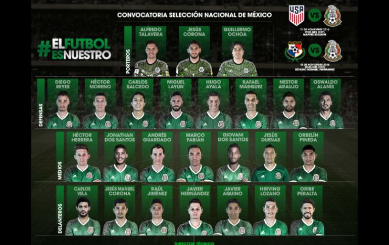 GUADALAJARA, JALISCO (03/NOV/2016).- La Dirección de Selecciones Nacionales dio a conocer la convocatoria de jugadores para enfrentar los partidos de eliminatoria mundialista ante Estados Unidos y Panamá.El técnico nacional, el colombiano Juan Carlos Osorio, decidió llamar a la mayor parte de los jugadores que militan en equipos de primera división de Europa, incluidos Carlos Salcedo, llegado hace solo un par de meses a la Fiorentina de Italia y Carlos Vela, que había estado ausente de los más recientes llamados a la Selección durante la gestión de Osorio.También fue convocado Giovani dos Santos, que juega para el Galaxy de Estados Unidos.La Selección Mexicana enfrentará al combinado de Estados Unidos en Columbus, Ohio el 11 de noviembre para después medirse al seleccionado de Panamá, en la Ciudad de Panamá, el día 15 del mismo mes.