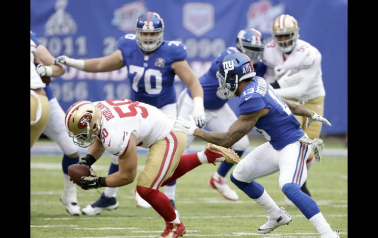 Deportes | San Francisco vence 16-10 a unos erráticos Gigantes de Nueva York Defensiva de 49ers salvaguarda la victoria San Francisco vence 16-10 a unos erráticos Gigantes de Nueva York Por: AP 16 de noviembre de 2014 - 16:38 hs Chris Borland, linebacker novato de San Francisco, interceptó un pase de Eli Manning. AFP / J. Szenes EAST RUTHERFORD, NUEVA JERSEY (16/NOV/2014).- Chris Borland, linebacker novato de San Francisco, interceptó un pase de Eli Manning en la yarda 2, con 4:43 minutos por disputar, para que los 49ers vencieran el domingo 16-10 a unos erráticos Gigantes de Nueva York. El pase interceptado llegó en cuarta oportunidad y coronó una estupenda actuación defensiva de los 49ers, que levantaron un muro frente a su zona de anotación para que los Gigantes sufrieran su quinta derrota en fila. Borland logró dos de los cinco interceptados por los 49ers (6-4), que sobrevivieron a un partido en el que una gran ventaja en tiempo de posesión y una serie de balones perdidos no se tradujeron en una paliza. Colin Kaepernick lanzó un pase de 48 yardas para que Michael Crabtree anotara, y Phil Dawson convirtió tres goles de campo en la primera mitad, para que San Francisco ganara su tercer duelo consecutivo en campo ajeno. Manning completó un envío de 19 yardas que permitió anotar al tight end Larry Donnell, en la primera ofensiva del encuentro. Pero los debilitados Gigantes (3-7) sólo consiguieron un gol de campo de Josh Brown en el resto del duelo. Temas NFL Futbol Americano Gigantes de Nueva York 49ers de San Francisco Lee También México vs Colombia • Momentos destacados • Partido amistoso México vs Argentina • Momentos Destacados • Cuartos de Final • Mundial Sub-20 "Chucky" Lozano reconoce que jugaría en Chivas o en América Dónde ver EN VIVO el México vs Argentina por el Mundial Sub-20 Recibe las últimas noticias en tu e-mail Todo lo que necesitas saber para comenzar tu día Registrarse implica aceptar los Términos y Condiciones