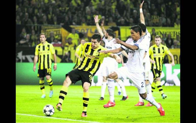 Deportes | Los equipos de la bundesliga sacan enorme ventaja ante las potencias españolas Desastre español en Alemania Borussia Dortmund golea al Real Madrid con cuatro goles de Lewandowski y se encarrila a una final germana en Wembley Por: EL INFORMADOR 25 de abril de 2013 - 03:09 hs El delantero polaco del Borussia Dortmund, Robert Lewandowski, al momento de marcar su segundo gol ante el Real Madrid. EFE / DORTMUND, ALEMANIA (25/ABR/2013).- La Bundesliga volvió a humillar a la Liga Española. Robert Lewandowski anotó cuatro goles y Borussia Dortmund esculpió un segundo tiempo perfecto para humillar ayer por 4-1 al Real Madrid y quedar al umbral de una final alemana en la Champions League. El sensacional ariete polaco marcó a los ocho, 50, 55 y 66 minutos (penalti), para dejar al Dortmund con una enorme ventaja de cara al partido de vuelta el próximo martes en el estadio Santiago Bernabéu de Madrid. Cristiano Ronaldo empató transitoriamente a los 43’. El Madrid recibió los mismos goles que su archirrival Barcelona el martes, cuando perdió 4-0 en su visita al Bayern Munich. Esa serie se define el próximo miércoles en el Camp Nou en Cataluña. Dortmund, campeón de la Bundesliga las dos últimas temporadas y dotado con una genial camada de jóvenes, arrinconó al Madrid desde el silbatazo inicial, aunque en principio con más vértigo que precisión. La tropa de José Mourinho, en cambio, apostó como siempre al contragolpe, pero sin orden en la salida y con bastantes pelotazos a las nubes. Aún invicto en el torneo, el Dortmund ha ganado todos sus seis partidos jugados como local. El Madrid, en tanto, volvió a naufragar en Alemania, donde han encajado seis derrotas en fila. Marco Reus dio el primer aviso del Dortmund apenas a los seis minutos, cuando hizo una diagonal al borde del área, arrastró varias marcas y remató cruzado, aunque el arquero Diego López alcanzó a manotear el balón. Lewandowski no perdió dos minutos después, al ganar la espalda del central Pepe para empujar a bocajarro un centro desde la banda izquierda de Marcel Schmelzer. Las acciones se nivelaron después del gol y el Madrid empezó a tomarle la mano al encuentro con mayor peso de Cristiano por la banda izquierda. El empate llegó al filo del entretiempo con colaboración de la defensa alemana: el madridista Luka Modric adelantó de taco un saque de banda y el central del Borussia, Mats Hummels —pretendido por el Barcelona para la próxima temporada—, regaló la pelota a Gonzalo Higuaín al tratar de cederla al arquero y capitán del Dortmund, Roman Weindenfeller. El argentino dio un pase a CR7, que definió con el arco vacío. Dortmund se reagrupó en el descanso y salió al complemento con los cañones bien apuntados. Lewandowski metió el segundo a los 50’ en una jugada válida al filo del fuera de lugar, empujando el balón sobre el filo del área pequeña ante la marca de Varane, hizo el tercero a los 55’ con una excelente jugada individual en la que pisó la pelota dentro del área y la metió al ángulo ante la marca de Pepe, y redondeó su póker a los 66’ desde el punto de penalti, fuerte por arriba al centro del marco, tras una falta de Xabi Alonso cometida a Marco Reus. El Dortmund pudo haber sacado un marcador más amplio, pero las manos del arquero merengue Diego López intervinieron para evitar un daño mayor. Aunque el Dortmund está cerca de disputar su segunda final, luego de ganar la Champions en 1997, Mourinho señaló que el Madrid no bajará los brazos. El Dortmund no se inmutó con el sofocón causado en la víspera del duelo cuando se informó que el Bayern Munich había fichado a su talentoso volante ofensivo Mario Goetze para la próxima temporada. Y encima, ayer la prensa alemana consideraba como un hecho el rumor de que el centro delantero del Borussia y figura ante el Real Madrid, Robert Lewandowski, acompañe a Goetze al Bayern Munich para la próxima campaña. Previo al duelo, el contención alemán de origen turco, Ilkay Gundogan, y el mismo DT del Dortmund, Jürgen Klopp, podrían emigrar al Real Madrid en el verano; el primero como relevo generacional para Xabi Alonso, y el segundo como uno de los grandes candidatos ante una posible salida de Mourinho del banquillo blanco. AP Es remontable: Mourinho El técnico del Real Madrid, José Mourinho, se mostró optimista al terminar el juego de ida ante el Borussia Dortmund, al declarar que el 4-1 en contra “es remontable” en España. “En el futbol no hay imposibles”, dijo el entrenador portugués. “Cualquier cosa puede pasar la próxima semana”. Mourinho, a quienes muchos ya ubican en el Chelsea inglés, casi no se inmutó ante su peor derrota en su carrera en Champions League. “Esta noche vimos sobre el campo de juego a un equipo que fue claramente superior al otro, que dominó física y mentalmente a su rival. Definitivamente, hoy ganó el mejor equipo. Los goles que encajamos, fueron fruto de nuestros propios errores”, sentenció. Jürgen Klopp, el técnico anfitrión, destacó tras la victoria: “había que jugar fuerte para no perder el balón. Todavía tenemos que ir a Madrid, lo que no será un simple paseo. Jugamos un gran segundo tiempo, aprovechando lo bueno y despreciando el resto. ¡Fue, sencillamente, algo increíble!”. “Estoy feliz por mis cuatro goles, pero lo que importa es llegar a la final”, dijo Lewandowski. “Hemos demostrado que podemos tenerlo bajo control”, aseguró el polaco, figura del encuentro. Su compañero, el alemán Matts Hummels, también fue cauteloso pese a la favorable ventaja, “todo el equipo ha tenido un rendimiento excepcional, el público también. La final está más cerca pero tenemos que saber lo que nos espera en Madrid”, advirtió el zaguero. FRASE ''Ha faltado actitud en el equipo, y yo el primero. Tenemos que reflexionar todos juntos''. Sergio Ramos, capitán del Real Madrid. LOCAL INVICTOBorussia gana siempre en casa> El Borussia 