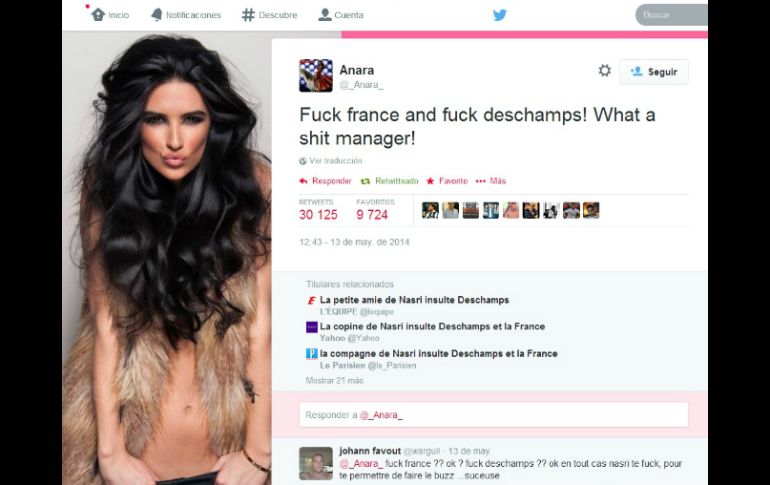 Deportes | La modelo Anara Atanes insultó al técnico francés en su cuenta de Twitter Deschamps demanda a novia de Nasri La modelo Anara Atanes insultó al técnico francés en su cuenta de Twitter Por: AP 16 de mayo de 2014 - 10:32 hs Nasri no irá al mundial y la bella Atana comentó ''que se joda Francia y que se joda Deschamps, entrenador de m...''. ESPECIAL / PARÍS, FRANCIA (16/MAY/2014).- Didier Deschamps demandó a la novia de Samir Nasri por los tuits insultantes que la mujer publicó después que el técnico de la selección francesa excluyó al jugador de Manchester City del plantel para el Mundial. El abogado de Deschamps, Carlo Alberto Brusa, dijo que radicó una querella por "insultos públicos" el viernes en un tribunal en París. Indicó que la pareja de Nasri, Anara Atanes, puede ser multada si es hallada culpable. El abogado dijo que la Federación Francesa de Futbol no está demandando a Atanes. La FFF indicó en un comunicado que respalda la acción de Deschamps. Poco después que Deschamps anunció que no llevaría a Nasri al Mundial de Brasil , en la cuenta de Twitter de Atanes aparecieron varios mensajes con palabras soeces. Luego, la mujer tuiteó: "Me disculpo si ofendí a alguien de Francia, mis tuits no iban dirigidos a toda la nación". Temas Futbol Internacional Demanda Twitter Selección de Francia Lee También Martinoli lanza indirecta a la polémica con Santiago Fernández Lupillo Rivera se deslinda de posible filtración de videos íntimos con Belinda ¿Dónde ver EN VIVO el partido de J14 Pumas vs San Luis? ¿Dónde ver EN VIVO el partido de J14 Xolos vs Toluca? Recibe las últimas noticias en tu e-mail Todo lo que necesitas saber para comenzar tu día Registrarse implica aceptar los Términos y Condiciones