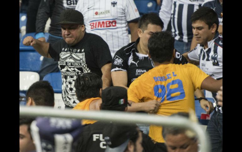 MONTERREY, NUEVO LEÓN (14/MAY/2017).- Un saldo de 33 aficionados detenidos, además de un civil y dos policías heridos, dejaron los disturbios registrados anoche a las afueras del estadio BBVA Bancomer, tras el partido de cuartos de final entre Rayados del Monterrey y Tigres de la UANL, informaron autoridades del municipio de Guadalupe.La Secretaría de Seguridad Pública guadalupense indicó que los 33 detenidos por desmanes, integran una lista preliminar y quedaron a disposición del Juez Calificador, para comenzar a deslindar las responsabilidades de cada uno de los participantes en las riñas que se exhibieron en redes sociales.El lesionado, un aficionado de los Tigres, agredido por fanáticos Rayados a la altura del Puente Exposición, fue trasladado a la Cruz Verde para su atención médica, añadió la corporación policiaca en un comunicado.De acuerdo al dictamen médico, agregó, el aficionado presentaba algunos golpes contusos en diferentes partes del cuerpo, los cuales no ameritaron su internamiento."En el reporte de hechos se informa que al acudir a contener a los rijosos sobre el Puente Exposición, dos elementos resultaron con golpes en la cara al momento de realizar las detenciones", añadió el parte oficial.Respecto al interior del inmueble deportivo, donde se dieron riñas entre los aficionados, "es responsabilidad de la seguridad interna del estadio y no de esta institución, quien se encarga conjuntamente con las demás corporaciones de resguardar el área perimetral del estadio", remarcó la autoridad municipal.