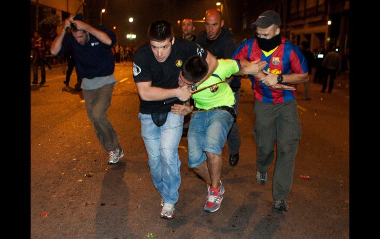 Deportes | Las personas habrían lanzado piedras y otros objetos y agredido a policías Detienen a 84 por disturbios en celebraciones en Barcelona Las personas habrían lanzado piedras y otros objetos, dañado infraestructura pública y agredido a policías Por: REUTERS 29 de mayo de 2011 - 07:24 hs -En la cima del mundo-Duele mucho: 'Chicharito' - Barcelona deja al “Chicharito”y al Manchester sin la ChampionsBARCELONA, ESPAÑA (29/MAY/2011).- Fuerzas de seguridad españolas detuvieron a más de 80 personas por desorden público y otras infracciones, mientras que unos 130 aficionados del futbol necesitaron asistencia médica, lo que enturbió las celebraciones por el cuarto título europeo del Barcelona. Alrededor de 50 mil aficionados se congregaron el sábado en la noche en el centro de la capital catalana tras la victoria 3-1 ante el Manchester United en el estadio londinense de Wembley y la mayoría celebró pacíficamente, dijo un comunicado de los Mossos d'Esquadra. Sin embargo, 84 personas fueron detenidas por desorden público, por lanzar piedras y otros objetos, daños a la infraestructura pública y agresión a policías, agregó. Unos 37 efectivos resultaron heridos, pero ninguno presentaba gravedad. Los jugadores del Bar Eca exhibirán el trofeo de la Liga de Campeones por la ciudad en un autobús abierto que saldrá del aeropuerto el domingo por la tarde y terminará el recorrido de la celebración en el Camp Nou. Temas Futbol Internacional Barcelona Champions League Lee También Chivas "borra" a Omar N de su historia tras presunto delito El Tri Sub-17 femenil va por la revancha mundialista en Marruecos ¿Dónde ver EN VIVO el partido de J13 Cruz Azul vs América? ¿Dónde ver EN VIVO el partido de J13 Chivas vs Mazatlán? Recibe las últimas noticias en tu e-mail Todo lo que necesitas saber para comenzar tu día Registrarse implica aceptar los Términos y Condiciones