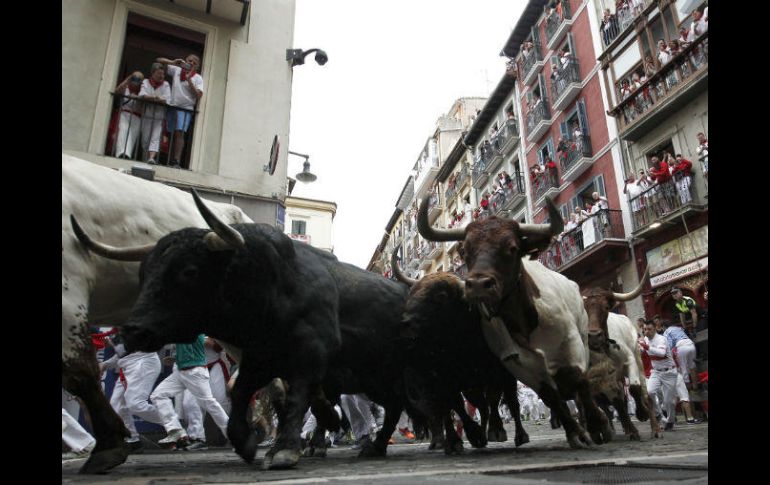 PAMPLONA, ESPAÑA (10/JUL/2017).- El cuarto encierro de los Sanfermines, el más rápido de las fiestas de este año, se saldó hoy con dos heridos leves por traumatismos entre las personas que corrieron ante los toros de la ganadería de Fuente Ymbro.Con menos mozos que otras jornadas, al ser un día laborable, y una temperatura fresca en Pamplona (norte), los toros hicieron una carrera veloz, de dos minutos y 17 segundos, y noble, ya que ningún corredor fue corneado, según el parte médico del Complejo Hospitalario de Navarra.Solo hubo dos heridos por contusiones, uno con traumatismo leve en un brazo y otro con un traumatismo maxilofacial, también de carácter leve.La manada corrió unida por el centro de la ciudad, hasta la plaza de toros, sin apenas prestar atención a los mozos, aunque el alto ritmo que imprimieron provocó sucesivas caídas e hizo pasar apuros a más de un corredor.Tras los cánticos tradicionales de los corredores pidiendo protección a San Fermín, a las ocho en punto de la mañana, hora local, sonó el cohete que abría la puerta de los corrales, y desde allí la torada corrió unida, con las reses mansas a la cabeza.Sólo hubo un momento de tensión, cuando en la calle Estafeta uno de los toros enganchó la ropa de un corredor con el asta pero sin que finalmente le penetrara en el cuerpo.Pocos metros más adelante se repitieron las caídas, aunque no hubo que lamentar heridos por asta de toro.De forma limpia y algo estirados, los toros cruzaron el callejón y entraron al coso en dos minutos y diecisiete segundos.Los astados serán lidiados hoy por la tarde en una nueva corrida de la feria.