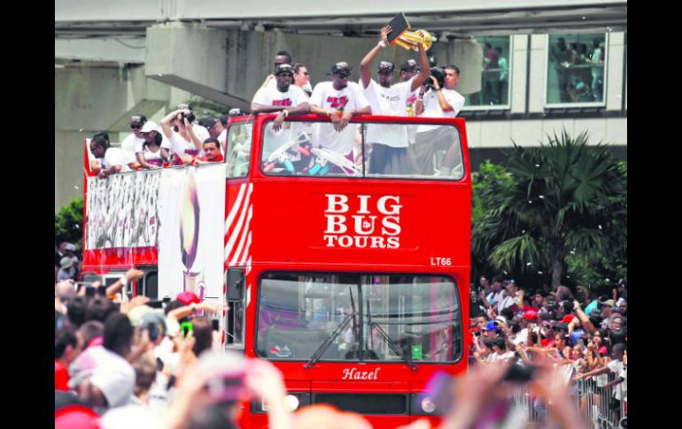 Deportes | Un desfile por la ciudad convoca aproximadamente a 400 mil personas El Heat festeja por las calles de Miami Un desfile por la ciudad convoca aproximadamente a 400 mil personas y otras 20 mil en el estadio para celebrar el campeonato Por: EL INFORMADOR 25 de junio de 2013 - 03:27 hs Un autobús descubierto circuló por las principales calles de Miami para que los aficionados pudieran aclamar a sus campeones. AP / MIAMI, ESTADOS UNIDOS (25/JUN/2013).- LeBron James asomó en la parte alta de un autobús descubierto de dos pisos con un cigarro en la boca y besó la copa. Shane Battier le tiró besos a la multitud que los vitoreaba y Dwayne Wade levantó una mano mostrando tres dedos. A esta altura, el campeón de la NBA sabe cómo festejar. Jugadores, familiares, personal y amigos se montaron en autobuses, cambiones y autos para participar en una caravana por el centro de Miami para celebrar la nueva conquista. Con otra gran actuación de su astro LeBron James, el Heat se coronó el jueves campeón de la temporada 2012-2013 tras vencer a los Spurs 95-88 y llevarse la serie final por 4-3. “Para mí, lo más importante que todos los MVP (Jugador Más Valioso, por sus siglas en inglés) que he logrado es ganar un campeonato”, dijo LeBron en el acto celebrado en la Arena. El desfile comenzó a las 11:00 horas locales en la famosa Calle Ocho y la Segunda Avenida y transitó después por el Downtown de Miami hasta llegar a la Arena Triple A. Se calcula que unas 400.000 personas se volcaron a las calles en un día de un calor agobiador para aclamar a los campeones. “Esto es lo más grande”, afirmó James al Sun Sports, la radio del Heat. “Para esto vine aquí, para poder participar en el desfile de fin de año. Me siento bendecido. No hay nada mejor que esto”. Varios jugadores rociaron a los aficionados con pistolas de agua en medio de una lluvia de papel picado, al son de ruidosas bandas que acompañaron los vehículos y de bocinazos. El gerente general Micky Arison y el presidente del Heat Pat Rile estuvieron en el primer bus. Durante el recorrido, los miembros del Heat mostraron su trofeo acompañados por sus familiares en camiones y autobuses descapotables. Los aficionados, por su parte, dieron rienda suelta al entusiasmo junto a sus líderes del equipo, como LeBron, el MVP (Jugador Más Valioso) de la temporada regular y la final, Dwyane Wade y Chris Bosh, los “Tres Grandes” del equipo, entre otros. Dentro de la Arena, donde todo era música y alegría, los cerca de 20 mil espectadores presentes fueron testigos de la presentación de cada uno de los miembros del equipo, que uno a uno tocaron el trofeo. “Fueron muchos sacrificios en el trabajo, todos estos chicos se merecían esto (el campeonato), no cabe dudas que fue algo increíble”, dijo el técnico del Heat de Miami, Erik Spoeltra. “Hemos ganado el campeonato y estamos junto a una comunidad que adora este juego, desde las personas que trabajan en cualquier función en la instalación, los directivos que me rodean y los jugadores”, señaló Pat Riley, presidente de la franquicia. El Heat ganó su primera corona en 2006 ganó la primera corona cuando D-Wade fue el MVP de esa final. El Heat venía de ganar también en la final el año pasado ante los Oklahoma City Thunder, por lo que en esta campaña la meta era repetir lo que pondría en camino el establecimiento de una nueva dinastía en la NBA. Con información AFP y AP FRASE "Este desfile por el Boulevard Biscayne fue lo que alguna vez imaginó (Pat) Rile como coach y ahora hemos hecho este recorrido tres veces. Es algo especial". Dwayne Wade, jugador de Miami. Temas NBA Basquetbol Miami Heat Lee También Billie Eilish fue agredida por fan en pleno concierto en Miami Astros de Jalisco toma ventaja sobre Xalapa en la semifinal de zona Iván Déniz confía en la fortaleza colectiva de Astros de Jalisco para Semifinales de Zona Astros de Jalisco, con nueva mentalidad y la mira en el campeonato Recibe las últimas noticias en tu e-mail Todo lo que necesitas saber para comenzar tu día Registrarse implica aceptar los Términos y Condiciones