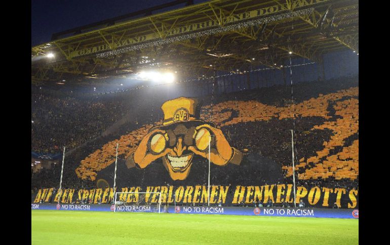 Deportes | Los aficionados se organizaron ''tras la pista de la copa perdida'' El Mosaico que alentó al Borussia Los aficionados se organizaron ''tras la pista de la copa perdida'' Por: EL INFORMADOR 10 de abril de 2013 - 07:19 hs Así lució la tribuna alemana durante el partido. EFE / DORTMUND, ALEMANIA (10/ABR/2013).- En tiempo de compensación, el Borussia Dortmund consiguió remontar un marcador adverso de 1-2 con dos goles ante Málaga para poder clasificarse a semifinales de la UEFA Champions League. Esos segundos fueron impactantes para el público, que también jugó su partido. Los aficionados en la tribuna lograron organizarse para armar un mosaico en apoyo a su escuadra. ''Tras la pista de la copa perdida'', decían. Fue impresionante la forma en la que los fanáticos se reunieron para apoyar y terminar con el estereotipo del aficionado alemán, ''frío''. No se sabe si esto se repetirá en el próximo cotejo del Borussia, pero al menos en la vuelta de los cuartos de final, llamó la atención a la par de los jugadores que participaron en la cancha. Temas Futbol Internacional Champions League Borussia Dortmund Lee También "Chucky" Lozano reconoce que jugaría en Chivas o en América Dónde ver EN VIVO el México vs Argentina por el Mundial Sub-20 ¿Dónde ver EN VIVO el partido amistoso México vs Colombia? El precio de la paz en Gaza Recibe las últimas noticias en tu e-mail Todo lo que necesitas saber para comenzar tu día Registrarse implica aceptar los Términos y Condiciones