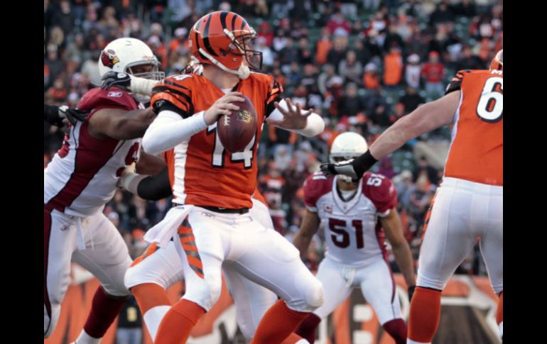 Deportes | Derrotan a los Cardenales de Arizona 23-16 El novato Dalton empata marca de liga en triunfo de los Bengalíes Andy Dalton concluyó el partido con 18 de 31 envíos para 154 yardas con dos pases de anotación Por: EFE 24 de diciembre de 2011 - 16:14 hs El mariscal de campo Andy Dalton (14) hizo envíos de 'touchdown' de once yardas a Jermaine Gresham, y de 19 a Jerome Simpson. AP / ESTADOS UNIDOS (24/DIC/2011).- El mariscal de campo novato Andy Dalton lanzó dos pases de anotación y los Bengalíes de Cincinnati detuvieron una remontada en el último cuarto para derrotar 23-16 a los Cardenales de Arizona y seguir en la contienda por un boleto a las finales de la Liga Nacional de Fútbol Americano (NFL). Los Bengalíes (9-6) se aseguraron apenas su tercera marca ganadora en las últimas 21 temporadas, y además continúan con posibilidades de conseguir un comodín en la Conferencia Americana (AFC). Dalton hizo envíos de 'touchdown' de once yardas a Jermaine Gresham, y de 19 a Jerome Simpson. El mariscal de los Bengalíes se unió a Peyton Manning (26), Charlie Conerly (22) y Dan Marino (20) como los únicos que en su campaña de novatos lanzaron al menos para 20 pases de anotación. Dalton concluyó el partido con 18 de 31 envíos para 154 yardas con dos pases de anotación. Los Cardenales (7-8) intentaron una remontada en el último cuarto, que lo iniciaron perdiendo 0-23, pero no fue posible por lo que vieron cortada su racha de triunfos y sus posibilidades de estar en la fase final de la Conferencia Nacional (NFC). El 'quarterback' John Skelton completó 23 de 44 pases para 297 yardas con dos pases de anotación y tres envíos interceptados. Temas NFL Futbol Americano Bengalíes de Cincinnati Cardenales de Arizona Lee También Futbol hoy 12 de octubre de 2025: ¿Dónde ver los partidos en vivo? Nos quedamos con sensaciones cortas: Eduardo Arce Hay jugadores que no estuvieron a la altura: Javier Aguirre César Montes intenta justificar la goleada ante Colombia Recibe las últimas noticias en tu e-mail Todo lo que necesitas saber para comenzar tu día Registrarse implica aceptar los Términos y Condiciones