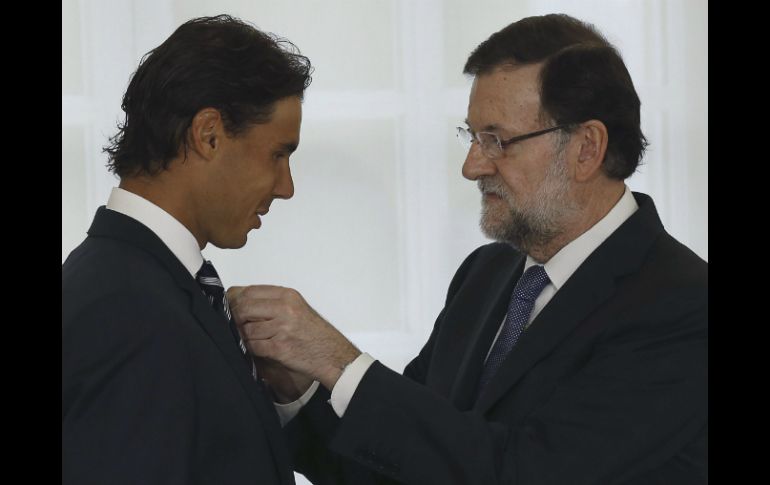 Deportes | El presidente de España, Mariano Rajoy fue quien entregó el reconocmiento al tenista Entregan a Nadal la Medalla de Oro al Mérito en el Trabajo El presidente de España, Mariano Rajoy fue quien entregó el reconocmiento al tenista Por: EFE 1 de mayo de 2015 - 08:34 hs MADRID, ESPAÑA (01/MAY/2015).- El presidente del gobierno español, Mariano Rajoy, entregó este viernes al tenista Rafael Nadal la Medalla de Oro al Mérito en el Trabajo, coincidiendo con la celebración del 1 de mayo. "Nunca imaginé recibir una medalla así, en un lugar así, tan importante como éste para nuestro país. Estoy muy agradecido", afirmó Nadal al recoger en el Palacio de la Moncloa de Madrid, residencia del presidente del gobierno, una de las principales condecoraciones civiles en España. "En cualquier cosa que hago siempre intento dar el máximo. Creo sin duda que ha sido una de las claves del éxito de mi carrera deportiva", añadió. Nadal iba a recoger su Medalla de Oro en noviembre, pero la ceremonia fue aplazada porque el deportista tuvo que operarse de apendicitis. Rajoy destacó las cualidades de Nadal en su trabajo. "Se le concede por su esfuerzo, su exigencia consigo mismo, su ilusión, equilibrio, modestia, por tener los pies en el suelo. En suma, se le da por el trabajo bien hecho", afirmó el líder conservador. En su cuenta oficial de Twitter, Rajoy publicó además un 'selfie' que se hizo junto al tenista. "Selfie con el mejor tenista de nuestra Historia. Es una leyenda y símbolo de la mejor España. Gracias", escribió. En su brillante carrera, Nadal ha ganado 14 títulos del Grand Slam, nueve de ellos en Roland Garros. La próxima semana participa en el Masters 1000 de Madrid. Temas Tenis Premios Mariano Rajoy Rafael Nadal Lee También Novak Djokovic avanza a semifinales del Masters de Shanghái Sabalenka mantiene su racha ganadora Reconocen a Margarita Aranguren de Alfaro por una vida dedicada al servicio de los demás Entregan la cuarta edición del Premio a la Generosidad Jalisco Recibe las últimas noticias en tu e-mail Todo lo que necesitas saber para comenzar tu día Registrarse implica aceptar los Términos y Condiciones