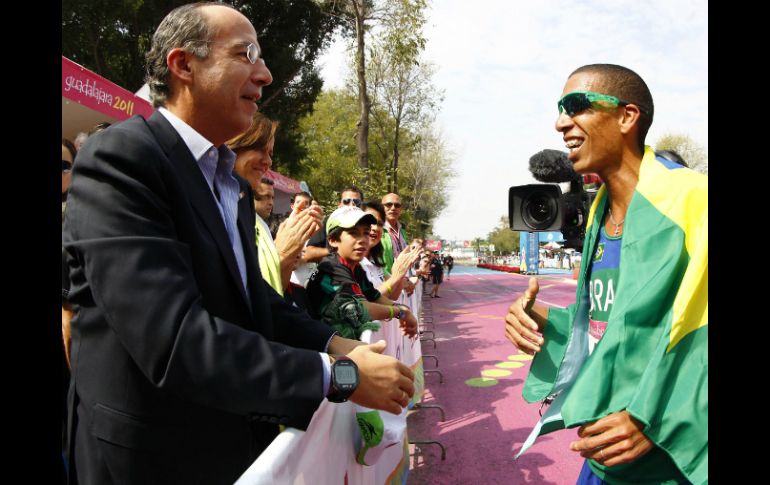Deportes | Junto a su esposa Margarita Zavala y sus hijos María, Luis Felipe y Juan Pablo Felipe Calderón asistirá a la clausura de Panamericanos El mandatario se encuentra en la ciudad, acompañado de su esposa Margarita Zavala y sus hijos María, Luis Felipe y Juan Pablo Por: NTX 30 de octubre de 2011 - 11:14 hs Esta mañana, el mandatario asistió a la prueba de maratón varonil. En la foto felicita al ganador Solonei Siva. REUTERS / GUADALAJARA, JALISCO (30/OCT/2011).- El presidente Felipe Calderón Hinojosa viajó esta mañana a la ciudad de Guadalajara, Jalisco, para asistir a la ceremonia de clausura de los XVI Juegos Panamericanos 'Guadalajara 2011'. Acompañado por su esposa Margarita Zavala y sus hijos María, Luis Felipe y Juan Pablo, el mandatario viajó a esa ciudad de occidente. El titular del Ejecutivo federal, de acuerdo con información de la Presidencia de la República, asistirá al juego final de baloncesto, donde se disputarán la medalla de oro los equipos de México y Puerto Rico. Calderón Hinojosa concluyó ayer su participación en la Cumbre Iberoamericana de Jefes de Estado y de Gobierno que se celebró en Asunción, Paraguay y a su regreso a México decidió a la ceremonia de clausura de los Juegos Panamericanos. El presidente de la República inauguró el 14 de octubre pasado dicha justa deportiva, en la que la delegación mexicana ha alcanzado una marca histórica en la obtención de medallas de oro, al contabilizar 42 preseas. Para saber A su llegada, el mandatario asistió a la prueba de maratón varonil, en la cual felicitó al ganador brasileño Solonei Siva. Temas Felipe Calderón Juegos Panamericanos 2011 Lee También Flavia Pennetta y Francesco Bagnaia, entre portadores de la antorcha olímpica 2026 México alcanza cinco plazas para los Juegos Olímpicos de Invierno 2026 Donovan Carrillo asegura su lugar en los Juegos Olímpicos de Invierno 2026 Jaecoo 5: Una SUV de aventura y pet friendly Recibe las últimas noticias en tu e-mail Todo lo que necesitas saber para comenzar tu día Registrarse implica aceptar los Términos y Condiciones
