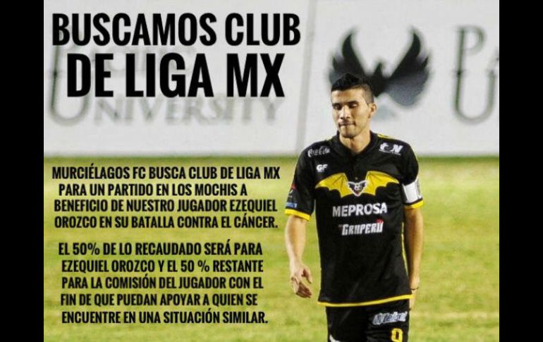 GUADALAJARA, JALISCO (10/JUN/2017).- Todo comenzó ayer con una convocatoria a través de la cuenta de Twitter de los Murciélagos de Los Mochis, del Ascenso MX."Murciélagos Fc busca club de Liga Mx para un partido en Los Mochis a beneficio de nuestro jugador Ezequiel Orozco en su batalla contra el cáncer"."El 50 por ciento de lo recaudado será para Ezequiel Orozco y el 50 por ciento restante para la Comisión del Jugador, con el fin de que puedan apoyar a quien se encuentre en una situación similar", se lee en el mensaje publicado por el club.Orozco, delantero de 28 años, surgió de Necaxa y jugó para Jaguares, Atlante, y Estudiantes de Altamira antes de llegar a Murciélagos el año pasado. Durante el draft apenas concluido el club renovó su contrato como muestra de solidaridad con el jugador.La petición del equipo de Los Mochis fue acogida por el Club América, de la Ciudad de México."Nosotros nos apuntamos, Murciélagos, definamos fecha", escribió en un tuit el club azulcrema.Moisés Muñoz, ex portero de las Águilas, sugirió realizar además una subasta antes del partido y se comprometió a contribuir con artículos para ese fin. Jean-pierre Gignac, delantero de Tigres e Isaac Brizuela, de Chivas, se sumaron a la propuesta, así como Marc Crosas, del Tampico Madero, y Patricio Araujo, del Puebla.Alan Pulido, delantero del Guadalajara, ofreció contribuir con la camiseta y los zapatos de juego que usó en la final que Chivas ganó el pasado mes de mayo ante Tigres.Los Pumas de la UNAM anunciaron que subastarán 20 camisetas firmadas por el primer equipo para ayudar a la causa.Yasser Corona, defensa de Tijuana que se recupera de una grave lesión, propuso un partido de estrellas contra Murciélagos, posibilidad a la que Oribe Peralta, delantero de América, se dijo dispuesto a participar.Murciélagos agradeció a través de Twitter todo el apoyo mostrado escribiendo "¡Qué gusto verlos unidos!" y anunció que ya está en contacto con el Club América para establecer la fecha y hora del partido a beneficio de Orozco.