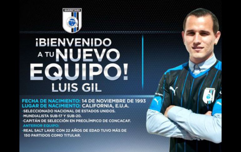 El mediocampista, seleccionado de Estados Unidos, con 22 años de edad, proviene del Real Salt Lake, de la MLS de su país."Luis Gil, seleccionado nacional de Estados Unidos, es nuevo jugador de los Gallos. Firmó por tres años. Bienvenido", informó el conjunto queretano.Gil ha sido mundialista Sub 17 y Sub 20 y esta será su primera aventura en el balompié extranjero, se espera en los próximos días se ponga bajo las órdenes del técnico Víctor Manuel Vucetich, quien aguarda la llegada de más refuerzos, para conseguir los objetivos pactados en el Clausura 2016.Hoy estuvo presente en el amistoso que disputó Querétaro contra Puebla, el cual terminó empatado a dos goles y también aprovechó para firmar su contrato.Luis Gil se suma al atacante Carlos Fierro, como los refuerzos de más peso que llegaron al equipo para la siguiente campaña, a la espera de alguna otra incorporación.