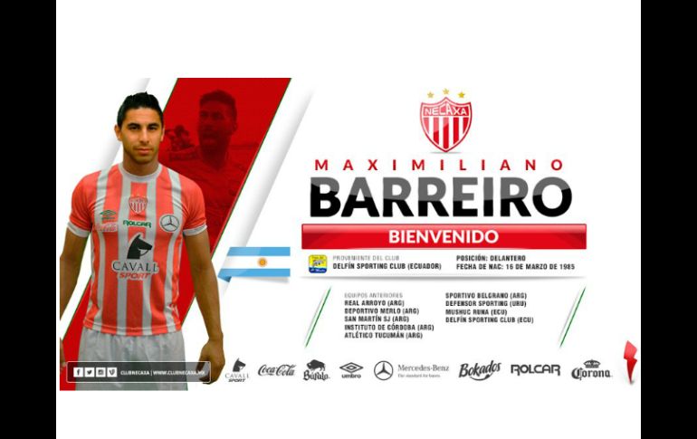 AGUASCALIENTES, AGUASCALIENTES (15/DIC/2016).- El delantero argentino Maximiliano Barreiro, máximo romperredes de la Primera División de Ecuador, se convirtió este día en el nuevo refuerzo de Rayos de Necaxa con miras al Torneo Clausura 2017 de la Liga MX. Barreiro, de 31 años de edad, proviene del conjunto ecuatoriano Delfín, con el que consiguió marcar 26 dianas dentro de la Liga en 2016. El atacante pampero también tuvo paso en las divisiones de Argentina, Primera B Metro, Primera B Nacional y en la máxima categoría, ha defendido los colores de los clubes Deportivo Merlo, San Martín de San Juan, Instituto, Atlético Tucumán. En Ecuador también jugó con Mushuc Runa y tuvo un breve paso en el balompié uruguayo con Defensor Sporting. Barreiro llega al cuadro de Aguascalientes para competir por un puesto o acompañar a elementos como Rodolfo Riaño, Fabián Espíndola, Jesús Isijara y Edson Puch.
