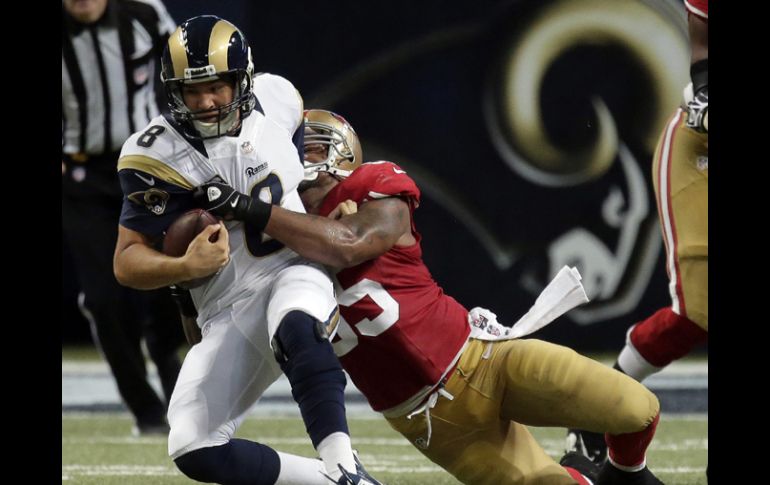 Deportes | San Francisco se imponen 35-11 a San Luis Gore y Kaepernick dejaron atrás la ''mini'' crisis de los 49ers Los Carneos de San Luis de San Luis cayeron 35-11 ante los 49ers de San Francisco Por: EFE 27 de septiembre de 2013 - 00:29 hs El quarterback de los Carneros de San Luis, Sam Bradford, es derribado por el linebacker de San Francisco, Ahmad Brooks. AP / SAN FRANCISCO, ESTADOS UNIDOS (27/SEP/2013).- Las interrogantes surgidas sobre el rendimiento del mariscal de campo de los 49ers de San Francisco, Colin Kaepernick, después de dos derrotas seguidas que sufrió el equipo, quedaron despejadas con la clara victoria que lograron en partido adelantado de la cuarta semana de la Liga Nacional de Fútbol Americano (NFL). Los 49ers visitaron el Edward Jones Dome, de San Luis, y se mostraron imparables con su ataque tanto por tierra como por aire al imponerse 35-11 al equipo local de los Carneros. Kaepernic lanzó dos pases de anotación, mientras que el corredor Frank Gore consiguió superar las 100 yardas por tierra en lo que va de temporada. Además la defensa de los 49ers, a pesar de las ausencias importantes que sufre, también encontró su mejor forma y no hizo concesiones a la ofensiva de los Carneros. Kaepernick completó 15 de 23 pases para 167 yardas, incluidos dos que fueron de anotación, no permitió ninguna interceptación, fue derribado dos veces de las 16 oportunidades que tuvo la defensa de los Rams y dejó en 115,7 su índice pasador. El mariscal de campo estelar de los 49ers tuvo como objetivo principal en la ofensiva por aire al recibidor abierto Anquan Boldin, que capturó cinco pases para 90 yardas y uno fue de "touchdown". Gore brilló con luz propia al hacer 20 acarreos y avanzar 153 yardas por tierra, su mejor marca en lo que va de temporada, y también hizo una anotación al correr 34 yardas hasta colocar el ovoide detrás de la línea de protección. El acierto de Kaepernick, Gore y Boldin permitió a los 49ers (2-2) recuperar el camino del triunfo y dejar atrás las dos derrotas de los partidos anteriors cuando fueron dominados por un marcador combinado de 46 yardas permitidas y sólo 10 anotadas. Esta vez también la defensa hizo un gran trabajo con el linebacker Navarro Bowman al frente, que hizo dos de los cinco derribos que registraron los 49ers, con uno que derivó en anotación del corredor Anthony Dixon en el cuarto periodo. El mariscal de campo titular de los Rams (1-3), Sam Bradford, no tuvo respiró con la presión que sufrió por parte de la defensa de los 49ers y siguió sin ser factor ganador para su equipo. Bradford completó 19 de 41 pases para 202 yardas, hizo un envío de anotación y también le interceptaron un ovoide, dejando en 59,2 su índice pasador. El pateador Greg Zuerlein convirtió un gol de campo de 40 yardas en el primer cuarto y rompió una racha de nueve partidos consecutivos que los Rams no habían podido inaugurar el marcador en el cuarto inicial. Pero la respuesta no se hizo esperar y los 49ers anotaron 28 puntos consecutivos que dejaron sentenciado el partido a su favor y superada la primera "mini" crisis desde que están bajo la dirección del entrenador en jefe Jim Harbaugh. Temas NFL Futbol Americano 49ers de San Francisco Carneros de Los Ángeles Lee También México vs Colombia • Momentos destacados • Partido amistoso México vs Argentina • Momentos Destacados • Cuartos de Final • Mundial Sub-20 "Chucky" Lozano reconoce que jugaría en Chivas o en América Dónde ver EN VIVO el México vs Argentina por el Mundial Sub-20 Recibe las últimas noticias en tu e-mail Todo lo que necesitas saber para comenzar tu día Registrarse implica aceptar los Términos y Condiciones