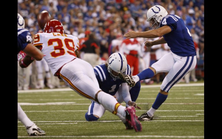 Deportes | Kansas City no pudo detener a unos Potros que se llevaron el triunfo por 19-9 Indianápolis para en seco a los Jefes Los Potros le quitan la etiqueta de invicto a Kansas City en duelo que se definió con goles de campo Por: NTX 10 de octubre de 2010 - 16:22 hs Adam Vinatieri (4) en el partido ante los Jefes de de Kansas City. REUTERS / INDIANÁPOLIS, INDIANA (10/OCT/2010).- Los Potros de Indianápolis le quitaron la etiqueta de equipo invicto a los Jefes de Kansas City, al derrotarlos 19-9 con cuatro goles de campo de Adam Vinatieri. El ex jugador de los Patriotas de Nueva Inglaterra hizo buenos intentos de gol de campo de 20, 24, 47 y 42 yardas para encaminar a los Potros a su tercera victoria de la temporada. La escuadra monarca de la Conferencia Americana (AFC) aseguró, en el último cuarto, su triunfo y el quitarle el paso perfecto a los Jefes con acarreo de touchdown de 11 yardas de Mike Hart. Peyton Manning concluyó el cotejo, que se disputó en el Lucas Oil Stadium, con 26 pases completos de 44 intentos para 244 yardas, ningún envío de anotación y una intercepción. Los Jefes de Kansas City se pusieron en el marcador con tres goles de campo de Ryan Succop, de 45, 35 y 43 yardas. Matt Cassel acabó el partido válido por la quinta semana de actividades de la NFL, con 16 pases completos de 29 intentos para 156 yardas, sin envío de touchdown ni intercepción. Temas NFL Futbol Americano Potros de Indianápolis Jefes de Kansas City Lee También La NFL suspende a Brian Branch por golpear a jugador de Chiefs NFL: Resultados del Monday Night Football Futbol hoy 14 de octubre de 2025: ¿Dónde ver los partidos en vivo? Javier Aguirre asegura que realizará siete u ocho cambios ante Ecuador Recibe las últimas noticias en tu e-mail Todo lo que necesitas saber para comenzar tu día Registrarse implica aceptar los Términos y Condiciones