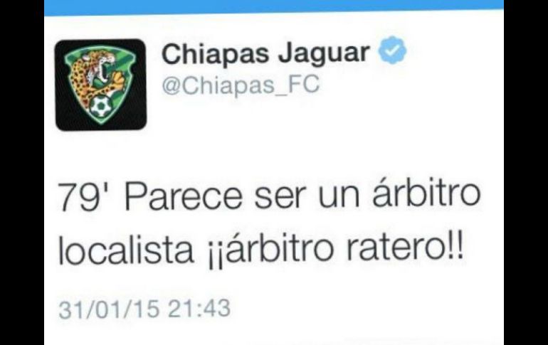 Deportes | La FMF decide que pagarán 140 mil 200 pesos por los mensajes publicados Jaguares recibe sanción por insultar a árbitro en Twitter La FMF decide que pagarán 140 mil 200 pesos por los mensajes publicados Por: NTX 5 de marzo de 2015 - 11:35 hs Este mensaje provocó que ahora el cuadro sureño sea multado. TWITTER / @Chiapas_FC CIUDAD DE MÉXICO (05/MAR/2015).- La directiva de Jaguares fue sancionada por la Comisión Disciplinaria con una multa de dos mil días de Salario Mínimo (140 mil 200 pesos), tras los mensajes publicados en su cuenta de Twitter, donde llamó "ratero" al árbitro Paul Enrique Delgadillo Haro. El 31 de enero, Chiapas visitó a León en el estadio Nou Camp en juego de la fecha cuatro del Torneo Clausura 2015 de Liga MX. En el segundo lapso el atacante colombiano Franco Faustino Arizala fue trabado por el portero William Yarbrough en el área, pero el juez central perdonó la clara pena máxima a los locales. Acto seguido, en su cuenta oficial de Twitter se publicó que el árbitro del encuentro no había señalado la falta y lo calificaron de "ratero". La directiva leyó el mensaje y más tarde desapareció, pero ya había sido visto por mucha gente. Ello motivó que se abriera una investigación por parte del tribunal de penas de la Federación Mexicana de Futbol (FMF), que este miércoles anunció el resultado de la misma. "La Comisión Disciplinaria determinó imponer una sanción de dos mil días de salario mínimo al Club Jaguares por contravenir el Código de Ética de la FMF, así como la Declaración de Juego Limpio y Ética Deportiva, al realizar declaraciones en redes sociales en detrimento de uno de los integrantes de la Comisión de Árbitros", precisó. Temas Futbol Mexicano Jaguares de Chiapas FMF Redes Sociales Lee También ¿Cuánto vale la 'Hormiga' González, joya de Chivas que ya es pretendida fuera de México? Atlas busca revancha ante León en el Estadio Jalisco México se impone a Países Bajos y respira en el Mundial Sub-17 Femenil Que siempre no: el Villarreal vs Barcelona no se jugará en EU Recibe las últimas noticias en tu e-mail Todo lo que necesitas saber para comenzar tu día Registrarse implica aceptar los Términos y Condiciones