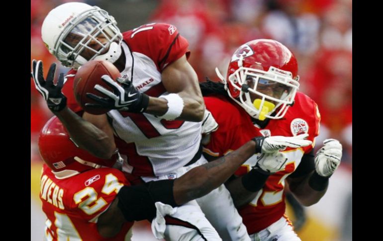 Deportes | Arizona junta cinco derrotas al hilo Jefes derrotan a Cardenales Los Cardenales de Arizona suman cinco derrotas consecutivas Por: AP 21 de noviembre de 2010 - 16:13 hs Brandon Flowers y Kendrick Lewis impidieron un pase para el conjunto de Arizona. AP / KANSAS CITY, MISURÍ (21/NOV/2010).- Dwayne Bowe atrapó dos pases de touchdown, para alcanzar seis partidos con al menos una anotación e imponer una nueva marca de su equipo, y los Jefes de Kansas City permanecieron invictos de locales al derrotar por 31-13 a los Cardenales de Arizona. En sus últimos seis partidos, Bowe ha acumulado 563 yardas en pases atrapados y suma 10 touchdowns con los Jefes (6-4), que comenzaron la jornada empatados con los Raiders de Oakland en el liderato de la División Oeste de la Conferencia Americana. Thomas Jones también tuvo un par de pases atrapados de anotación para los Jefes, que tienen foja de 5-0 de locales. Fue la quinta derrota en fila para los Cardenales (3-7), que quedaron a dos partidos y medio de los Seahawks en el Oeste de la NFC. Seattle jugaba más tarde contra los Santos en Nueva Orleáns. Temas NFL Futbol Americano Jefes de Kansas City Cardenales de Arizona Recibe las últimas noticias en tu e-mail Todo lo que necesitas saber para comenzar tu día Registrarse implica aceptar los Términos y Condiciones